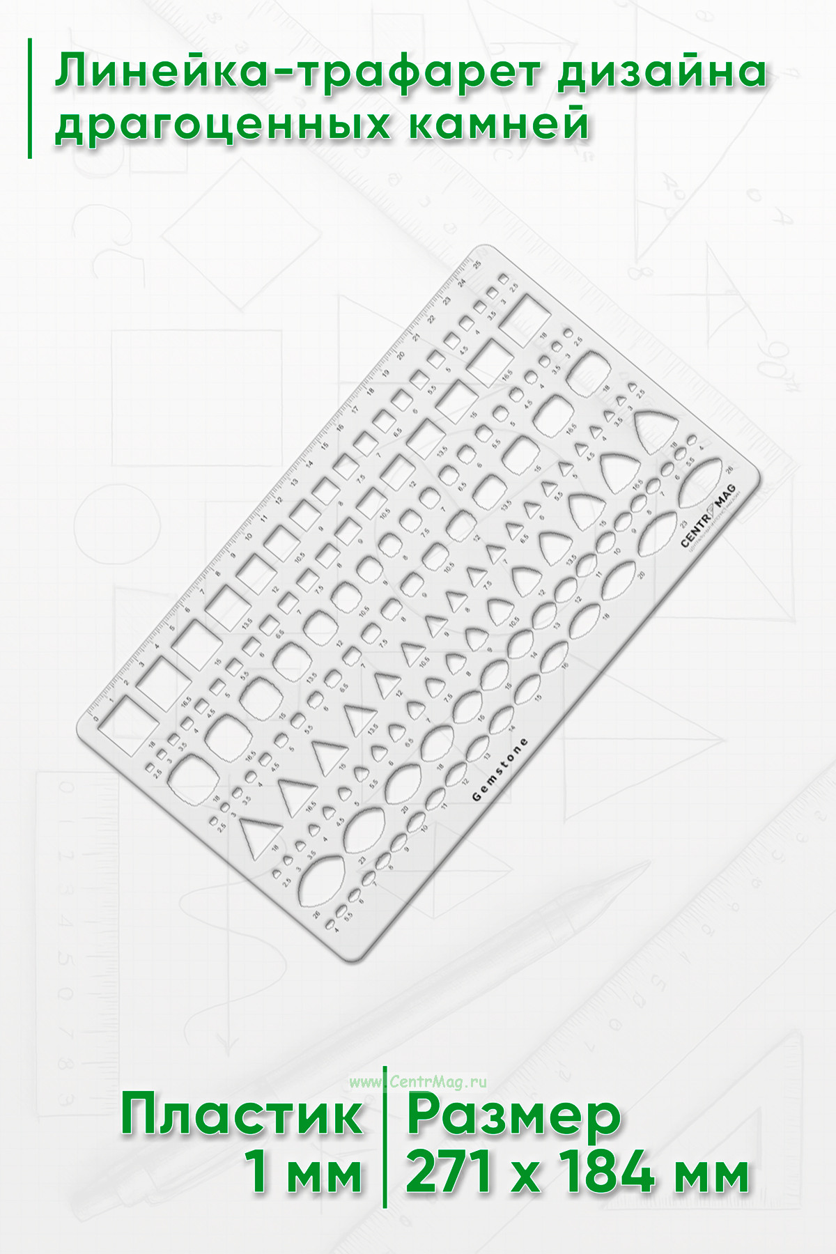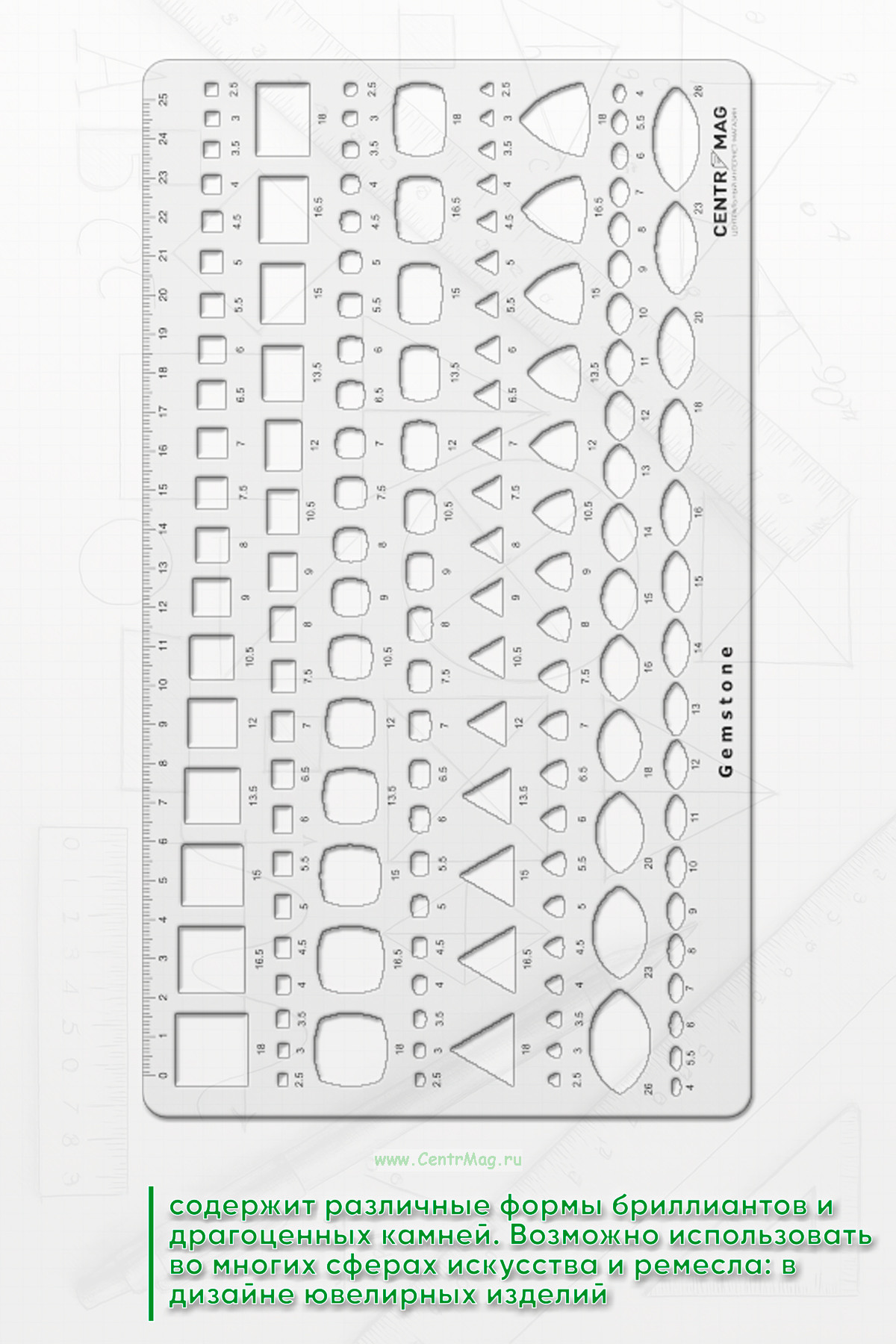 Линейка-трафарет содержит различные формы драгоценных камней. Возможно использовать во многих сферах искусства и ремесла: в дизайне ювелирных изделий, иллюстраций и открыток, а также для рисования фигур на различных поверхностях.