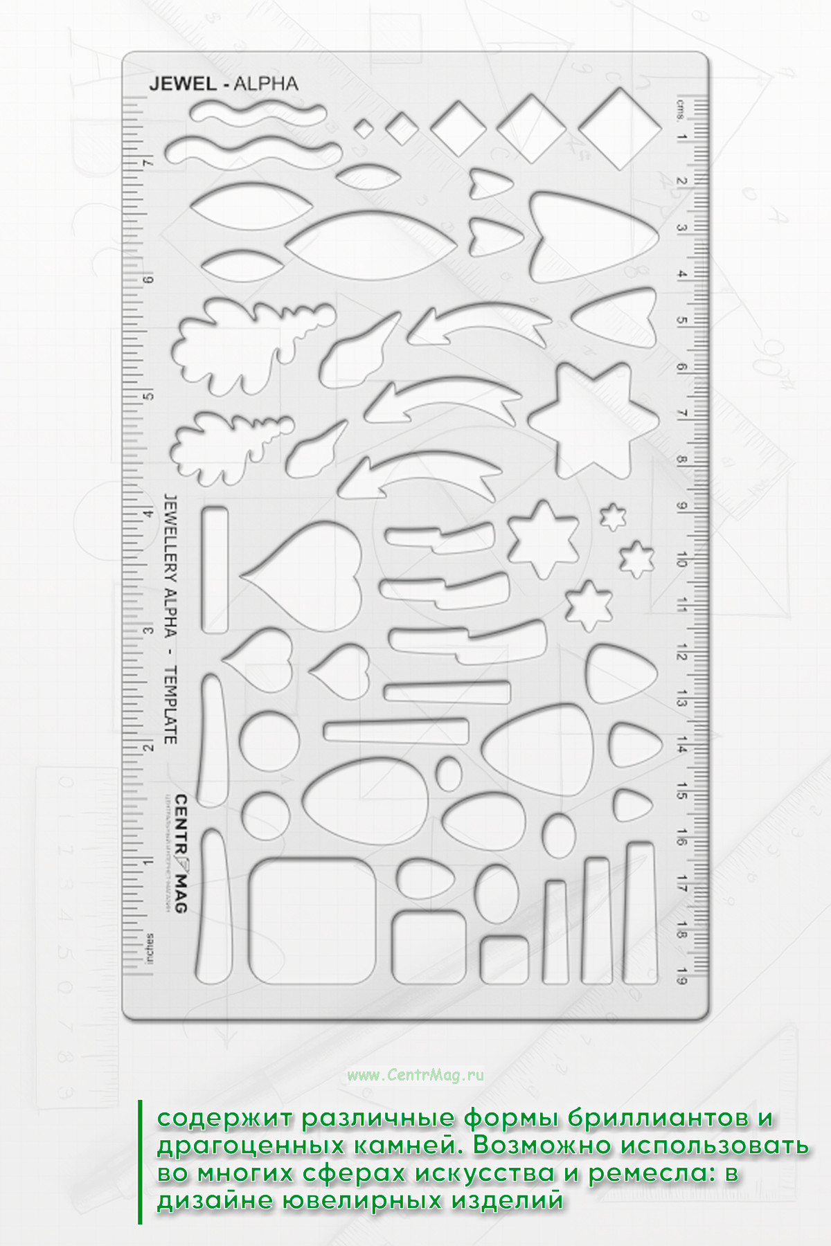 Линейка-трафарет содержит формы бриллиантов и драгоценных камней. Возможно использовать во многих сферах искусства и ремесла: в дизайне ювелирных изделий, иллюстраций и открыток, а также для рисования фигур на различных поверхностях.