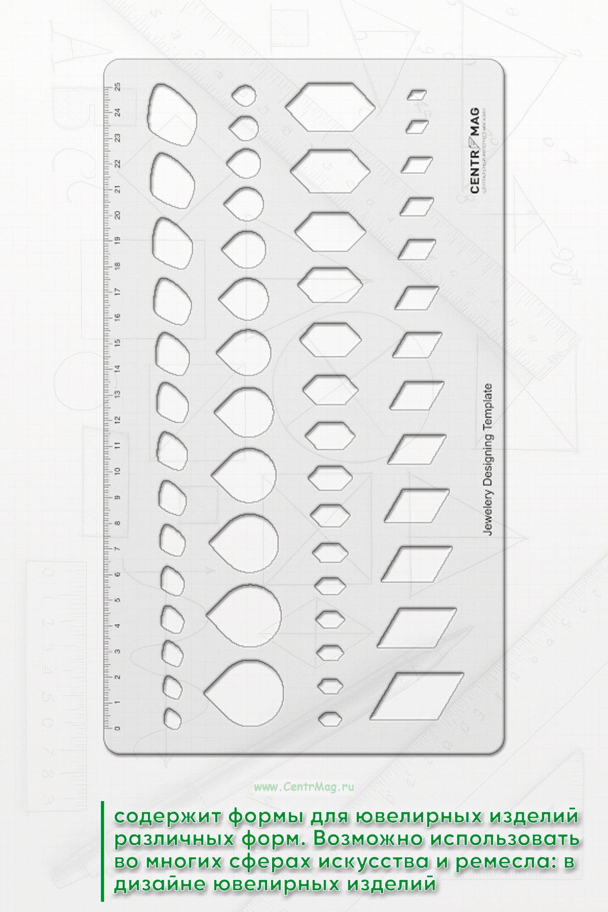 Трафарет содержит различные формы для ювелирных изделий. Возможно использовать во многих сферах искусства и ремесла: в дизайне ювелирных изделий, иллюстраций и открыток, а также для рисования фигур на различных поверхностях.