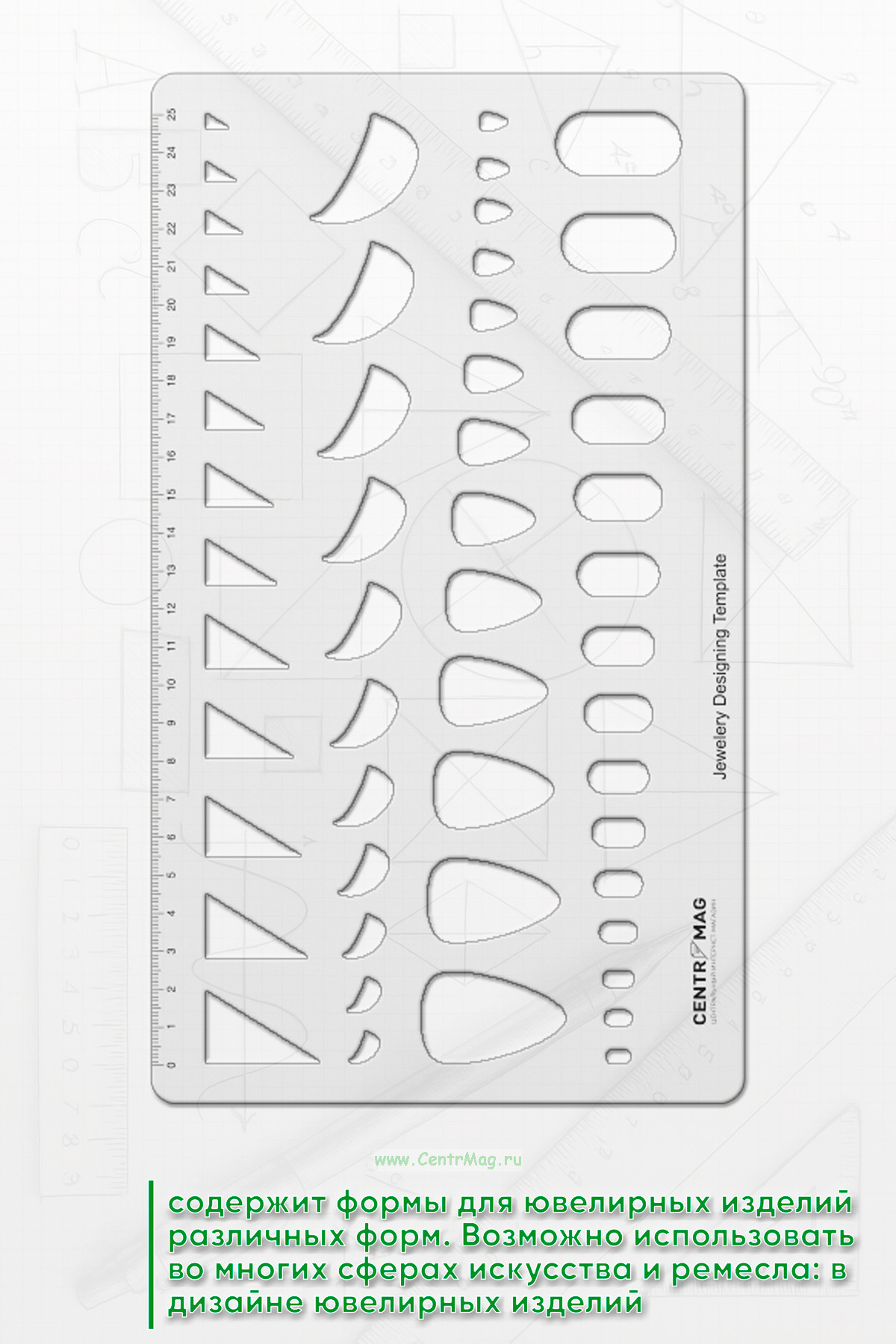 Трафарет содержит различные формы для ювелирных изделий. Возможно использовать во многих сферах искусства и ремесла: в дизайне ювелирных изделий, иллюстраций и открыток, а также для рисования фигур на различных поверхностях.