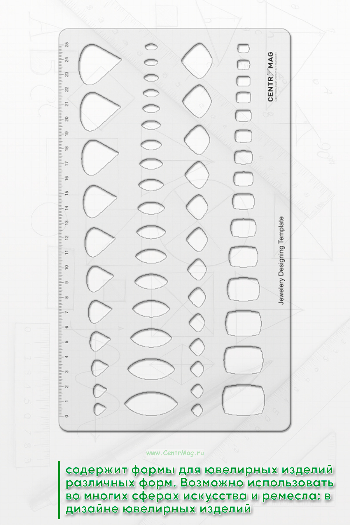 Трафарет содержит различные формы для ювелирных изделий. Возможно использовать во многих сферах искусства и ремесла: в дизайне ювелирных изделий, иллюстраций и открыток, а также для рисования фигур на различных поверхностях.
