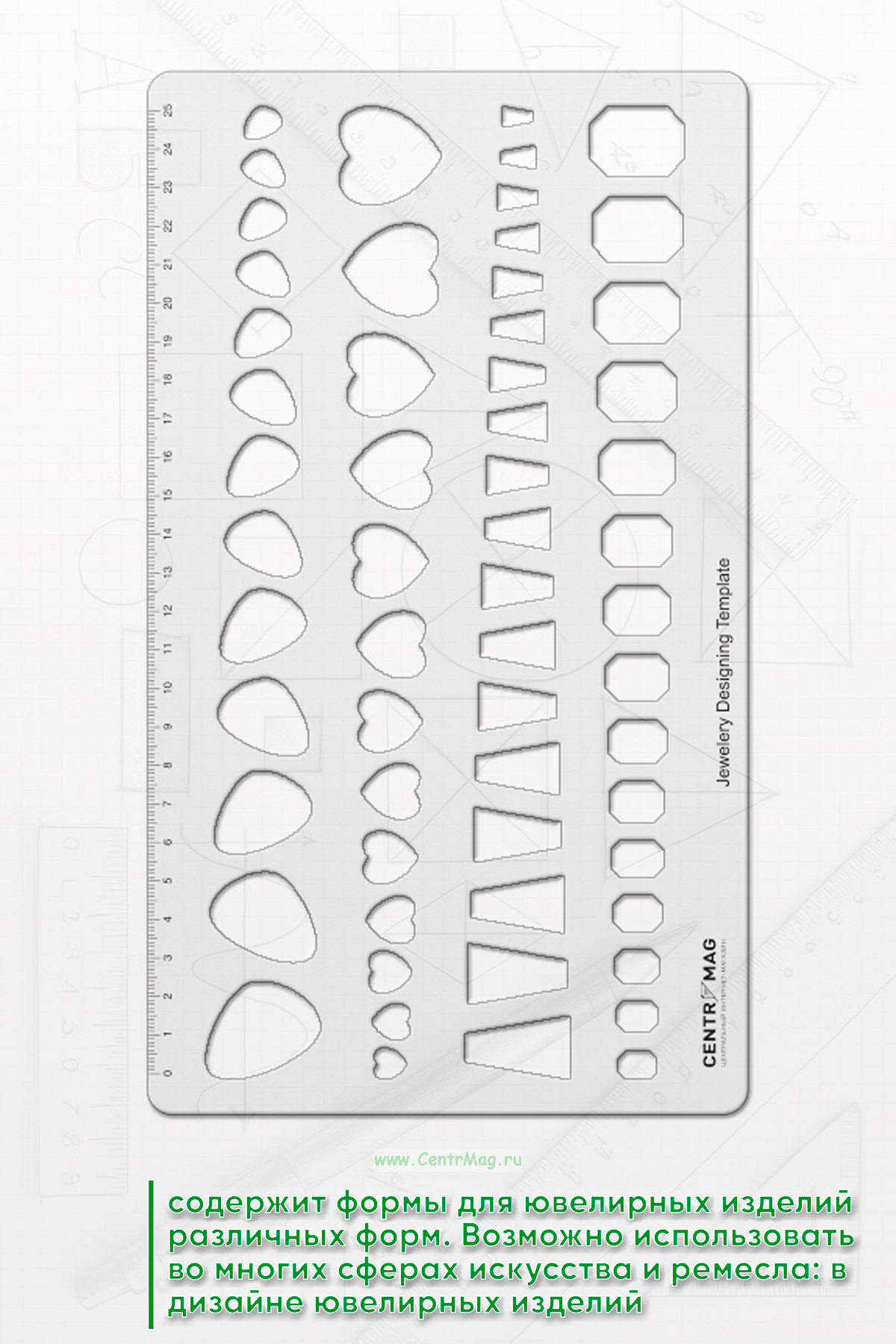 Трафарет содержит различные формы для ювелирных изделий. Возможно использовать во многих сферах искусства и ремесла: в дизайне ювелирных изделий, иллюстраций и открыток, а также для рисования фигур на различных поверхностях.