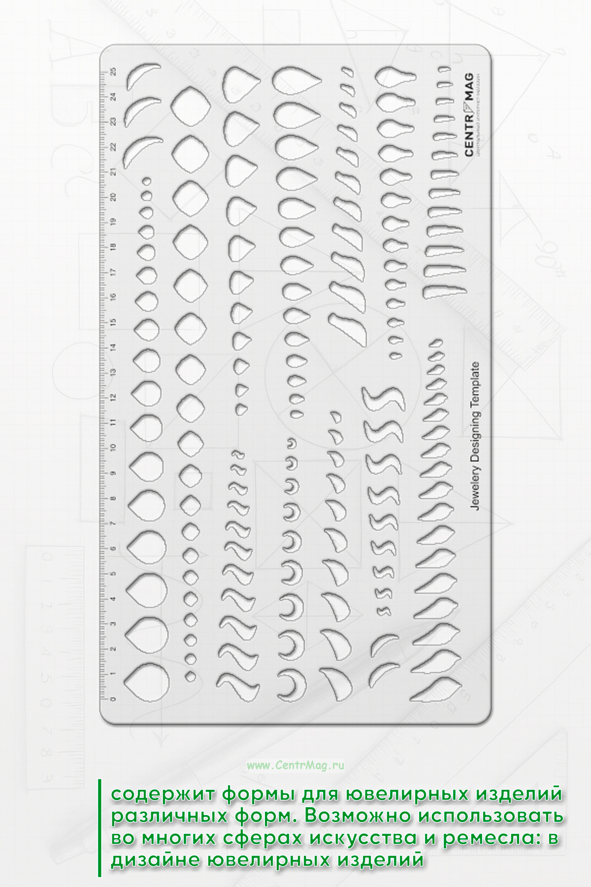 Трафарет содержит различные формы для ювелирных изделий. Возможно использовать во многих сферах искусства и ремесла: в дизайне ювелирных изделий, иллюстраций и открыток, а также для рисования фигур на различных поверхностях.