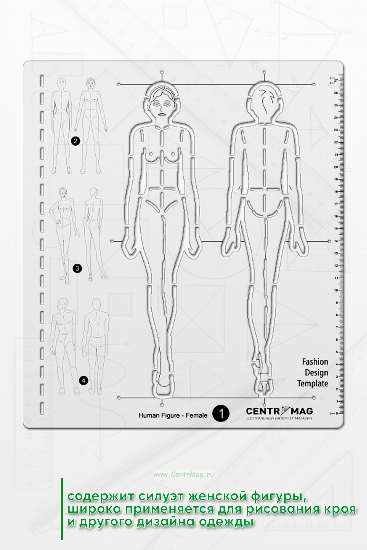 Линейка-трафарет содержит силуэт женской фигуры, у которой пропорции приблизительные, а линии точны. Поможет сэкономить время на рисование черновика и повысит эффективность работы. Линейка-трафарет широко применяется для рисования кроя и другого дизайна одежды. Подходит для дизайнеров, создателей узоров и портных.