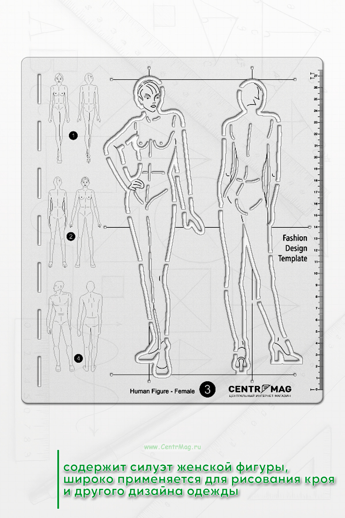 Линейка-трафарет содержит силуэт женской фигуры, у которой пропорции приблизительные, а линии точны. Поможет сэкономить время на рисование черновика и повысит эффективность работы. Линейка-трафарет широко применяется для рисования кроя и другого дизайна одежды. Подходит для дизайнеров, создателей узоров и портных.