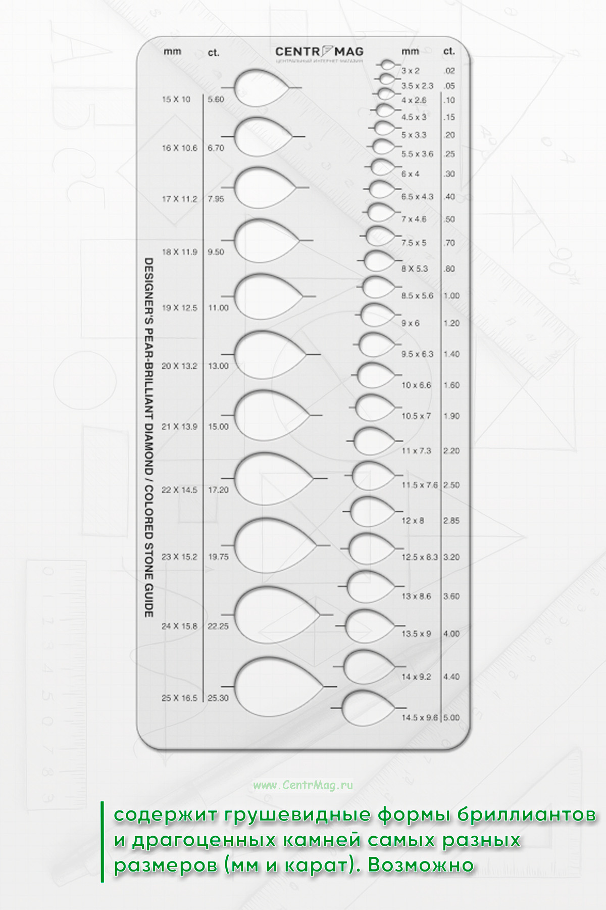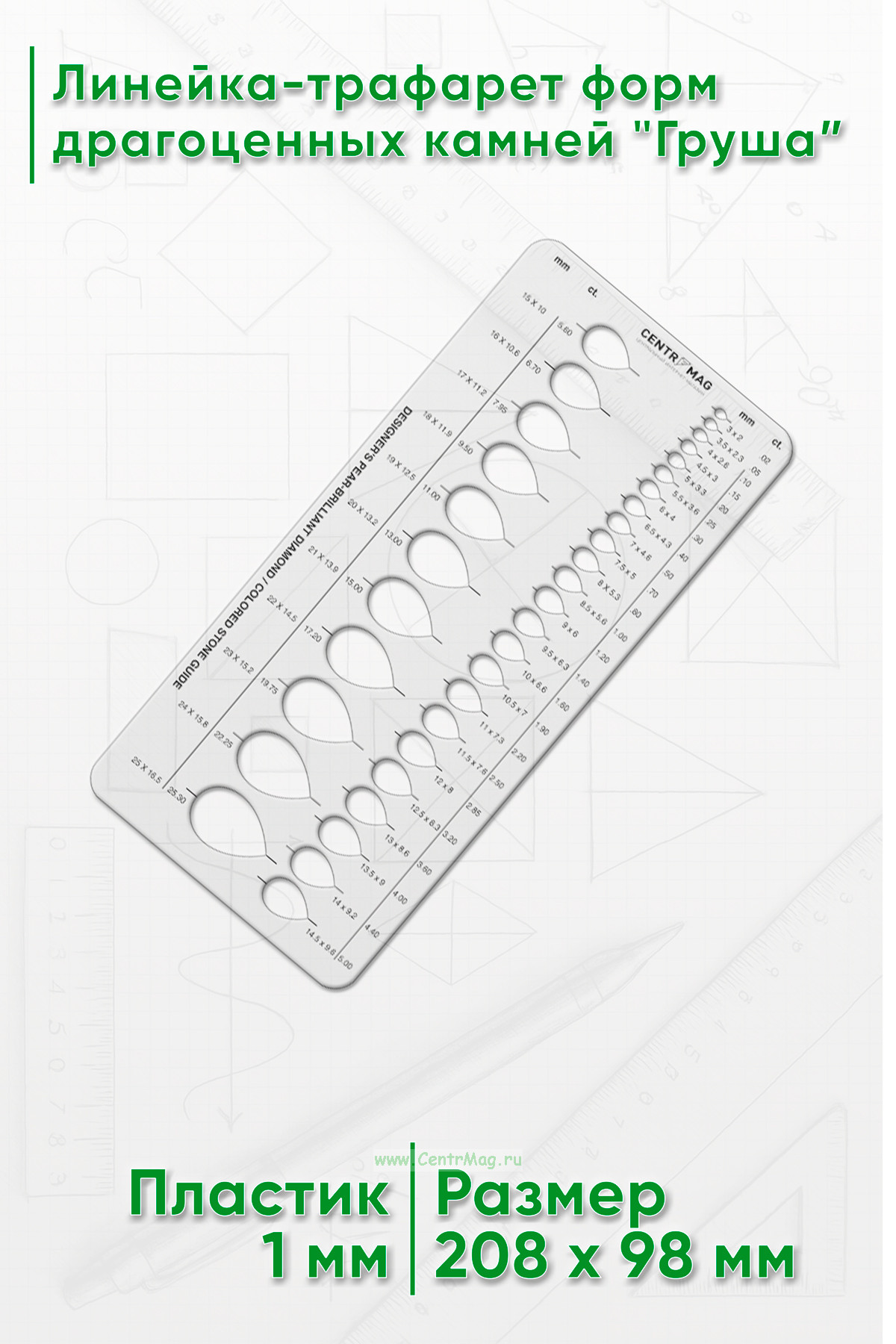 Линейка-трафарет содержит грушевидные формы бриллиантов и драгоценных камней самых разных размеров (мм и карат). Возможно использовать во многих сферах искусства и ремесла: в дизайне ювелирных изделий, иллюстраций и открыток, а также для рисования фигур на различных поверхностях.