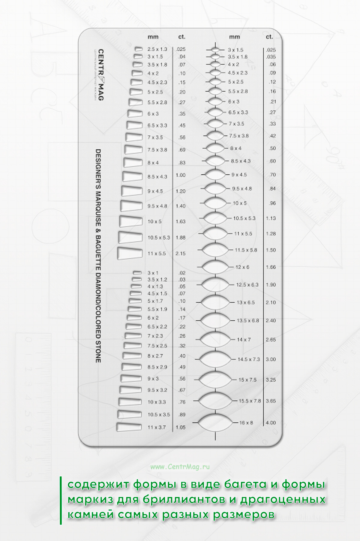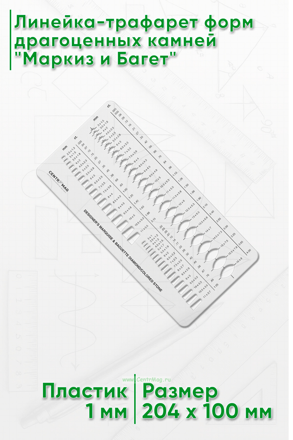 Линейка-трафарет содержит формы в виде багета и формы маркиз для бриллиантов и драгоценных камней самых разных размеров (мм и карат). Возможно использовать во многих сферах искусства и ремесла: в дизайне ювелирных изделий, иллюстраций и открыток, а также для рисования фигур на различных поверхностях.
