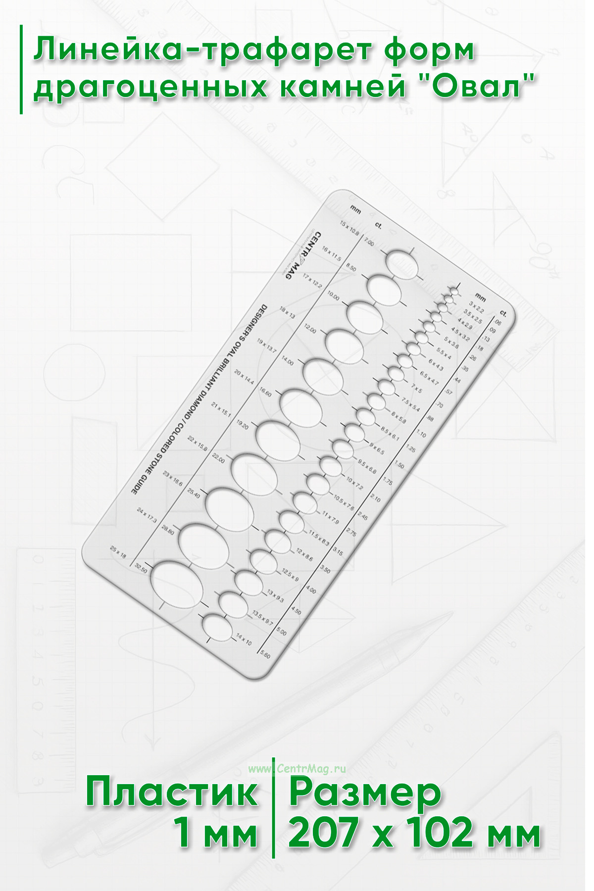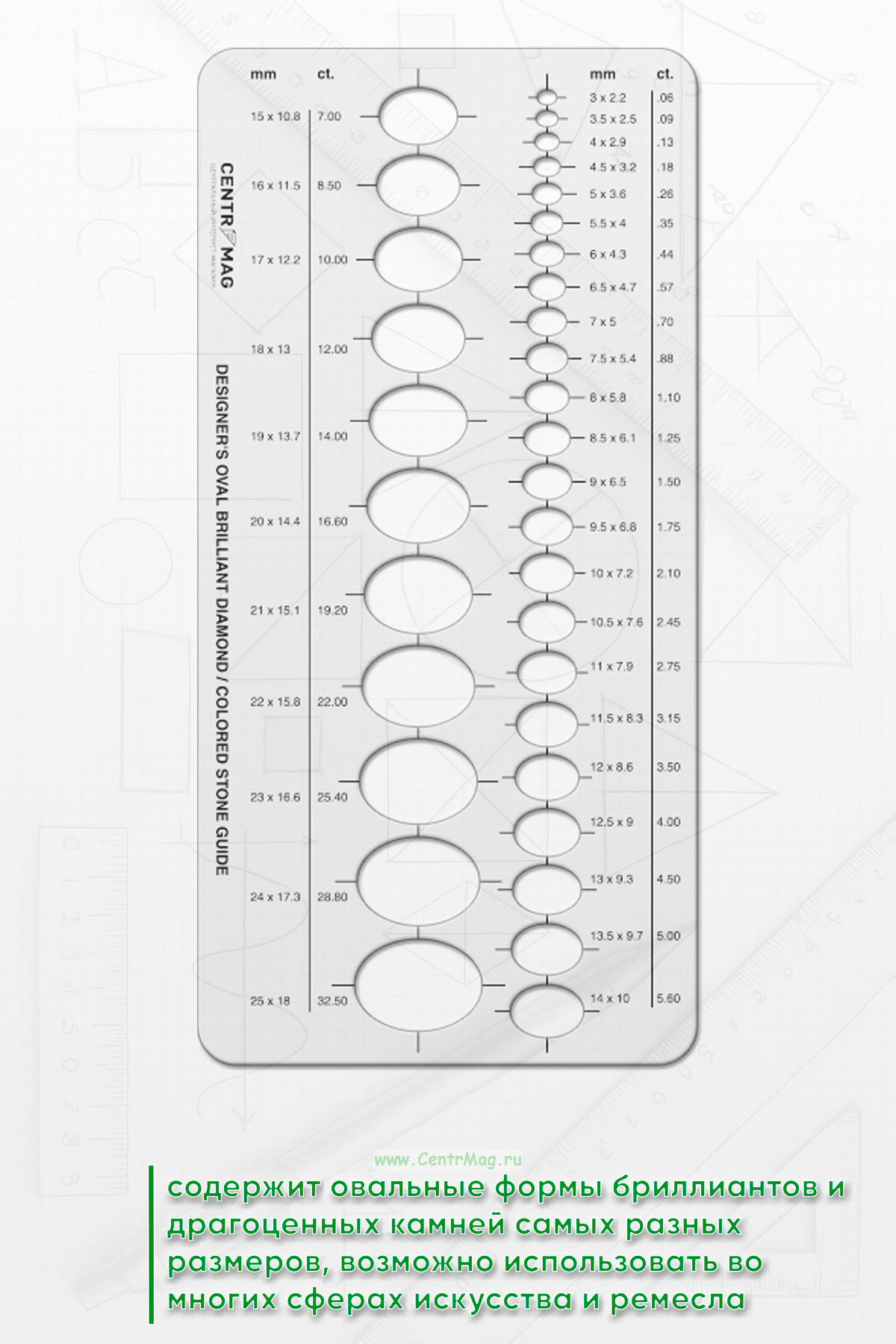 Линейка-трафарет содержит овальные формы бриллиантов и драгоценных камней самых разных размеров (мм и карат). Возможно использовать во многих сферах искусства и ремесла: в дизайне ювелирных изделий, иллюстраций и открыток, а также для рисования фигур на различных поверхностях.