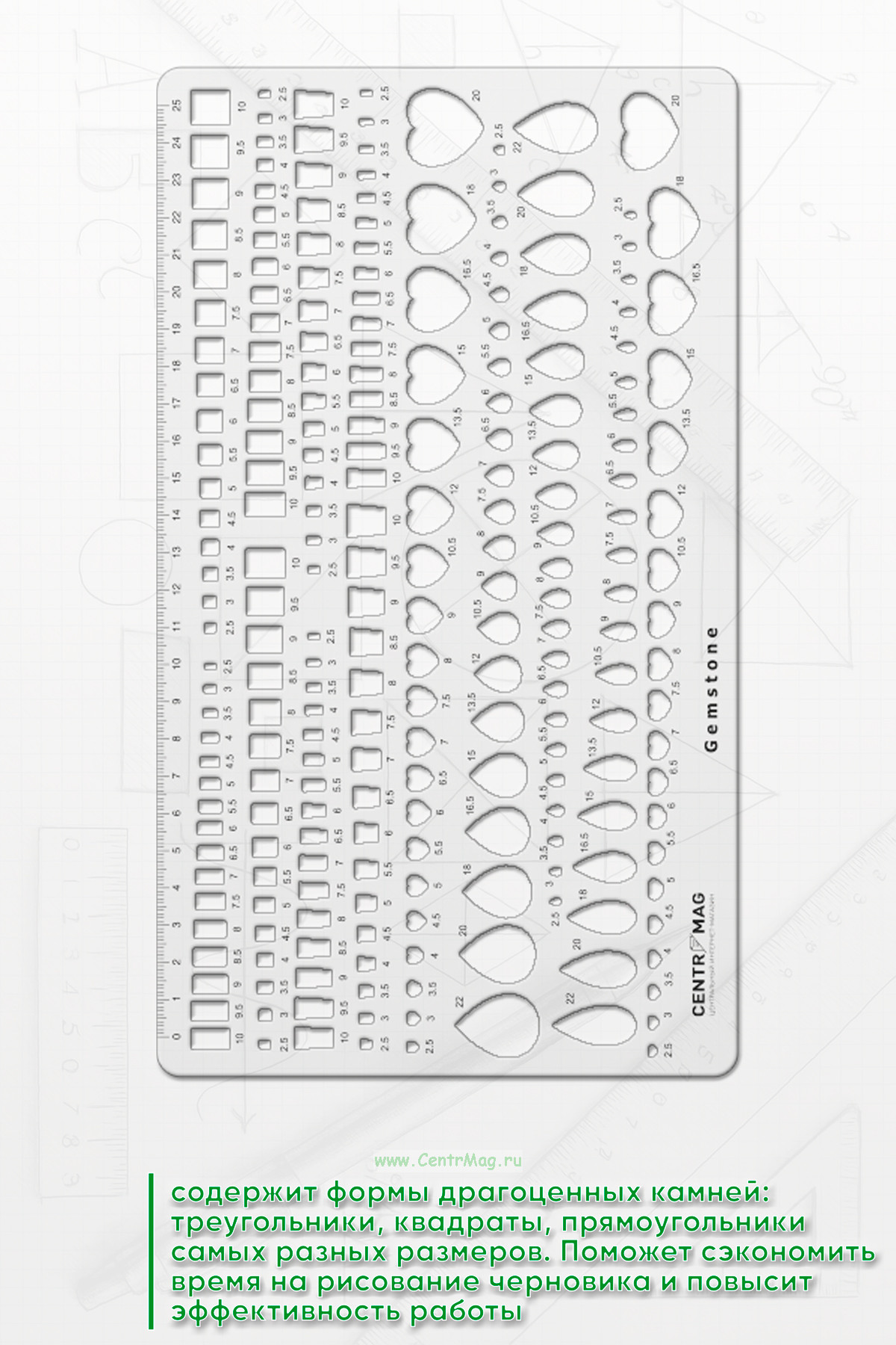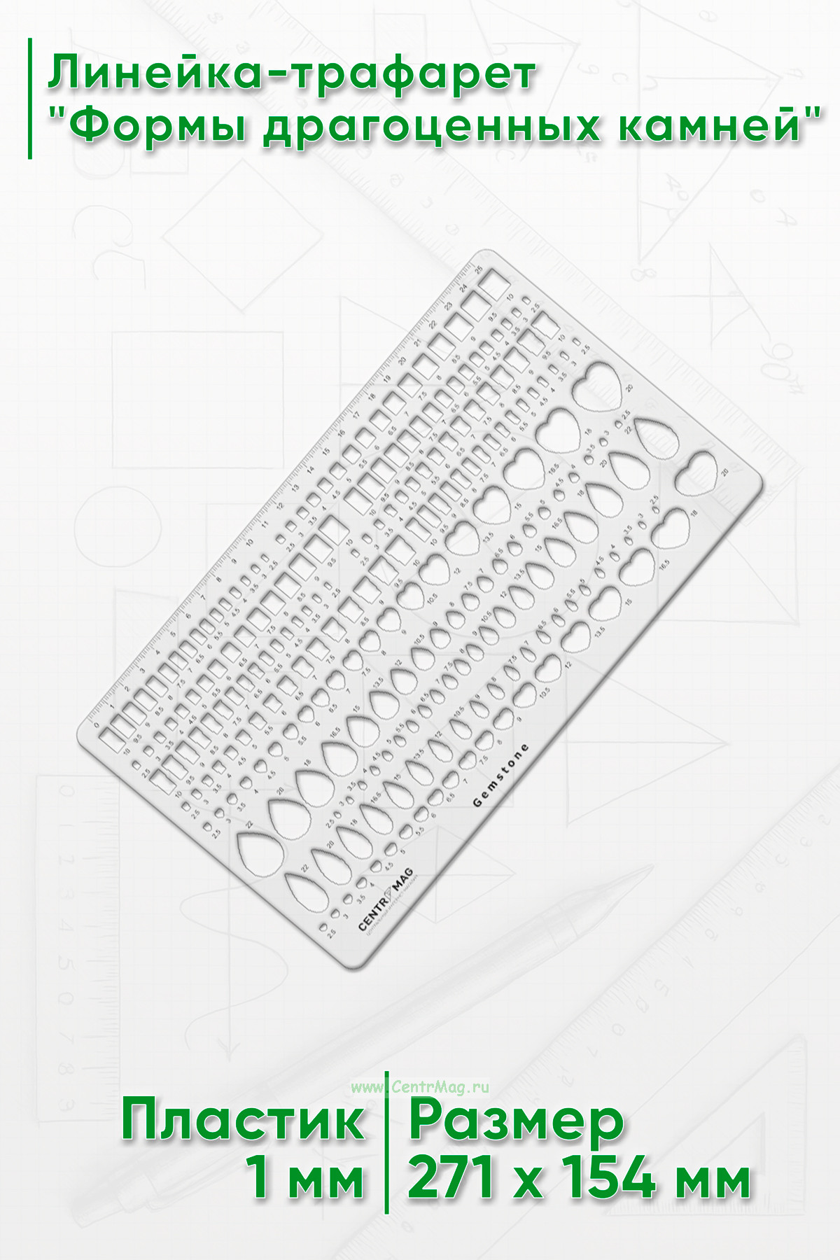 Линейка-трафарет содержит формы драгоценных камней: треугольники, квадраты, прямоугольники самых разных размеров. Поможет сэкономить время на рисование черновика и повысит эффективность работы. Возможно использовать во многих сферах искусства, а также для рисования фигур на различных поверхностях