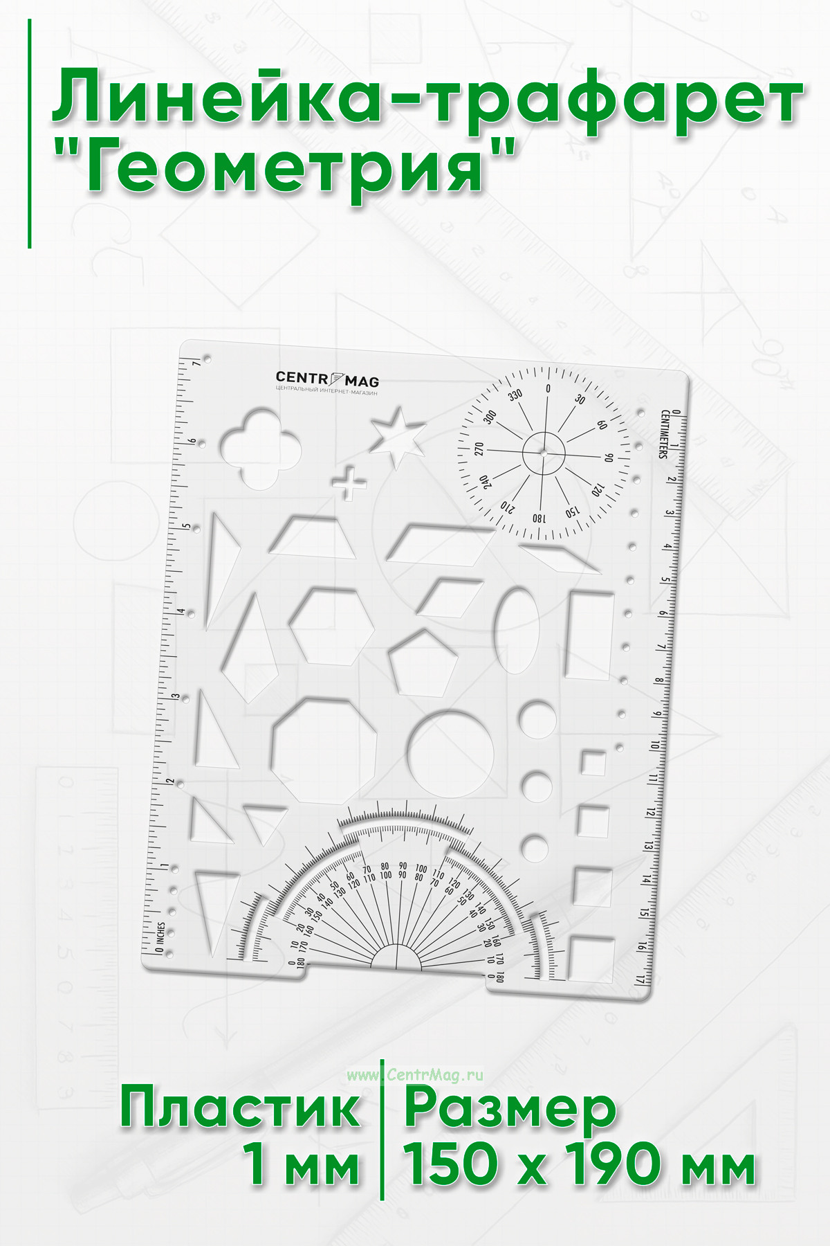 Линейка-трафарет позволяет быстро наносить геометрические фигуры и их комбинации, а также для измерения и записи линейных размеров. Имеется транспортир для измерения и построения углов.
