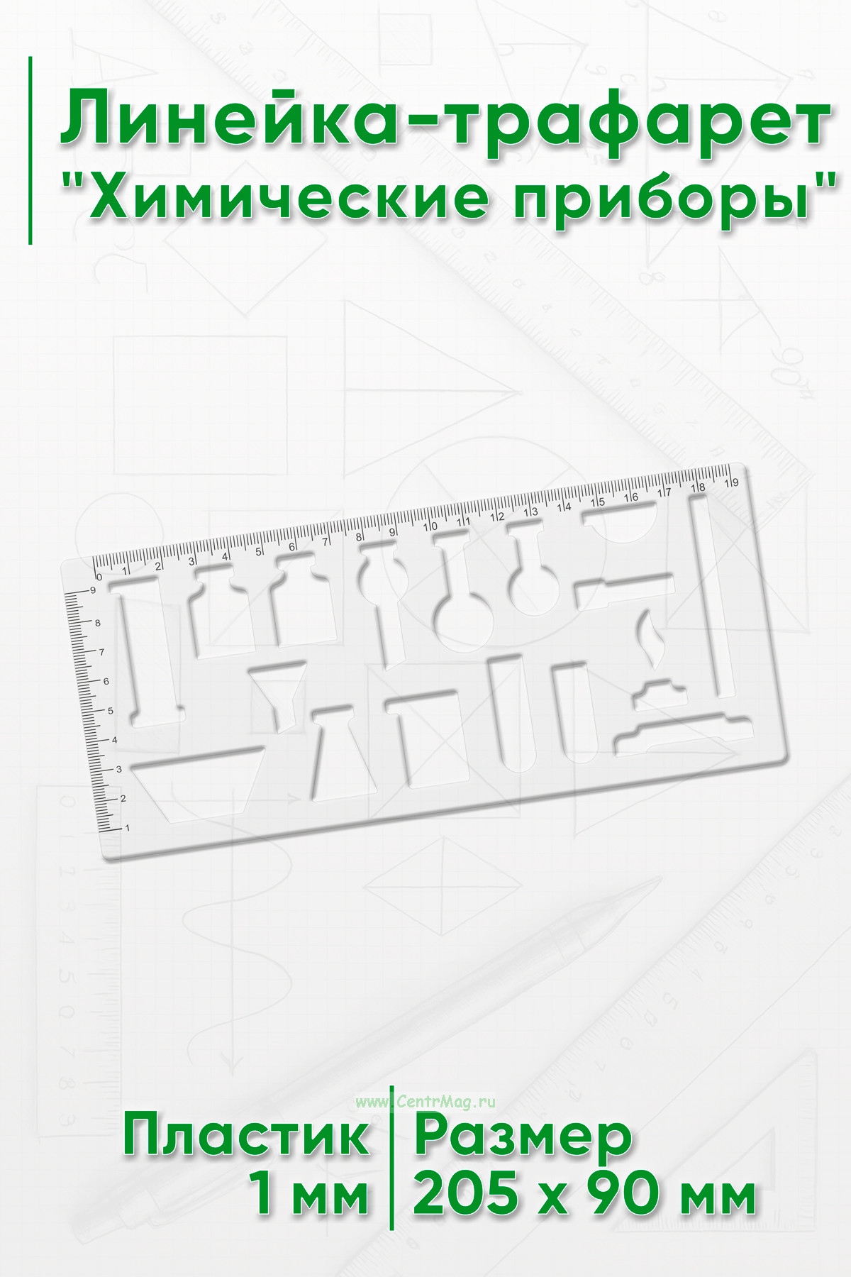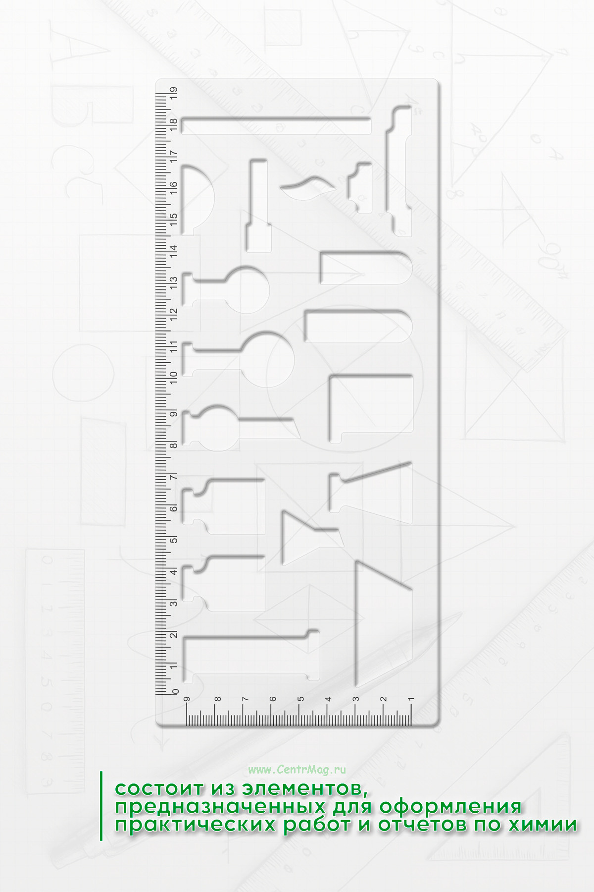 Линейка-трафарет состоит из большого количества необходимых элементов, предназначенных для оформления практических работ и отчетов по химии.