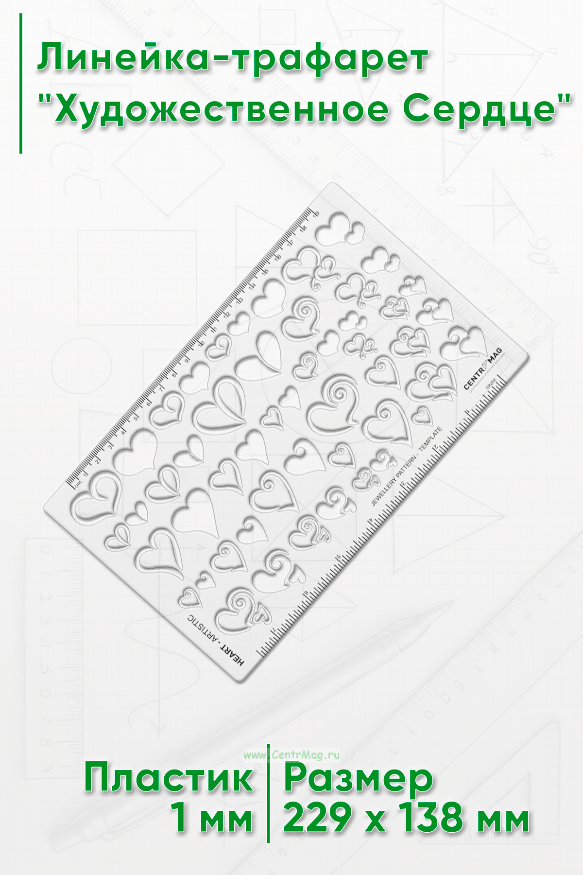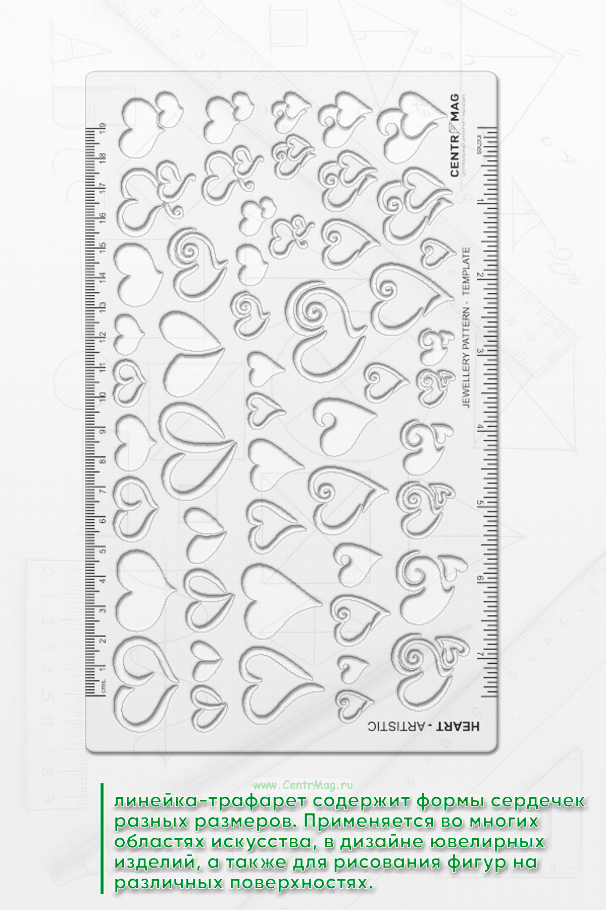 Линейка-трафарет содержит формы сердечек разных размеров. Применяется во многих областях искусства, в дизайне ювелирных изделий, а также для рисования фигур на различных поверхностях.