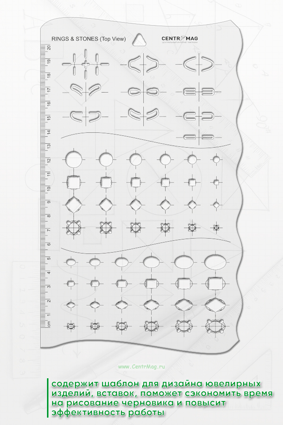 Линейка-трафарет содержит шаблон для дизайна ювелирных изделий, вставок. Поможет сэкономить время на рисование черновика и повысит эффективность работы. Возможно использовать во многих сферах искусства, а также для рисования фигур на различных поверхностях