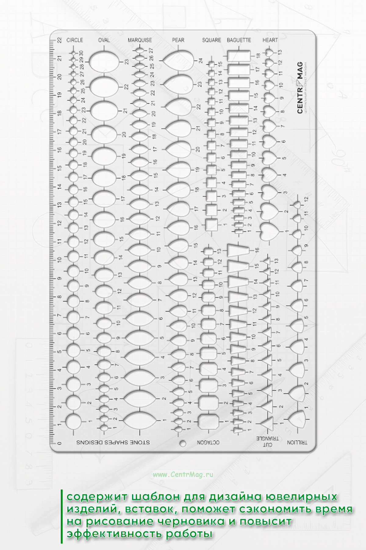 Линейка-трафарет содержит шаблон для дизайна ювелирных изделий, вставок. Поможет сэкономить время на рисование черновика и повысит эффективность работы. Возможно использовать во многих сферах искусства, а также для рисования фигур на различных поверхностях