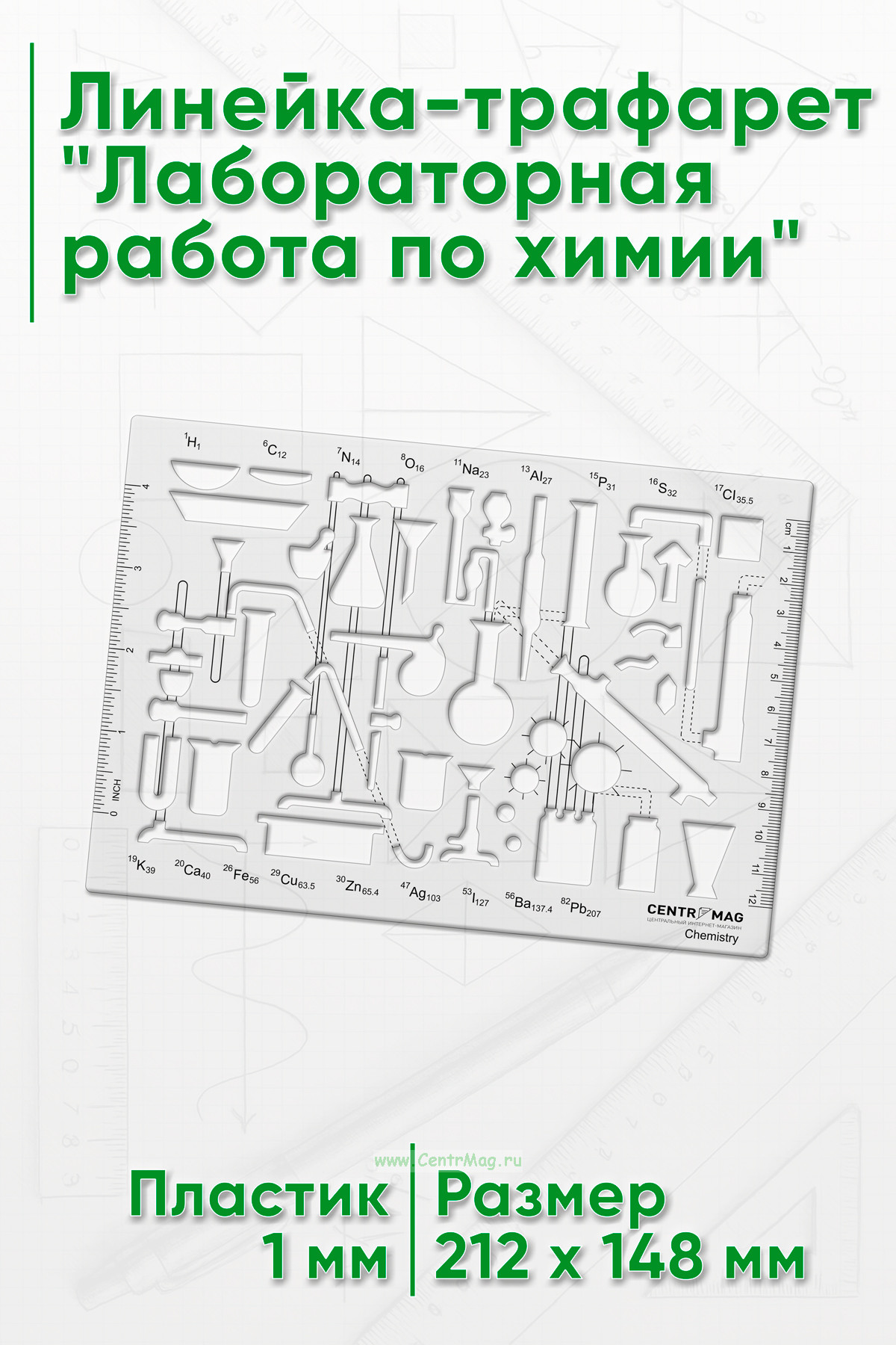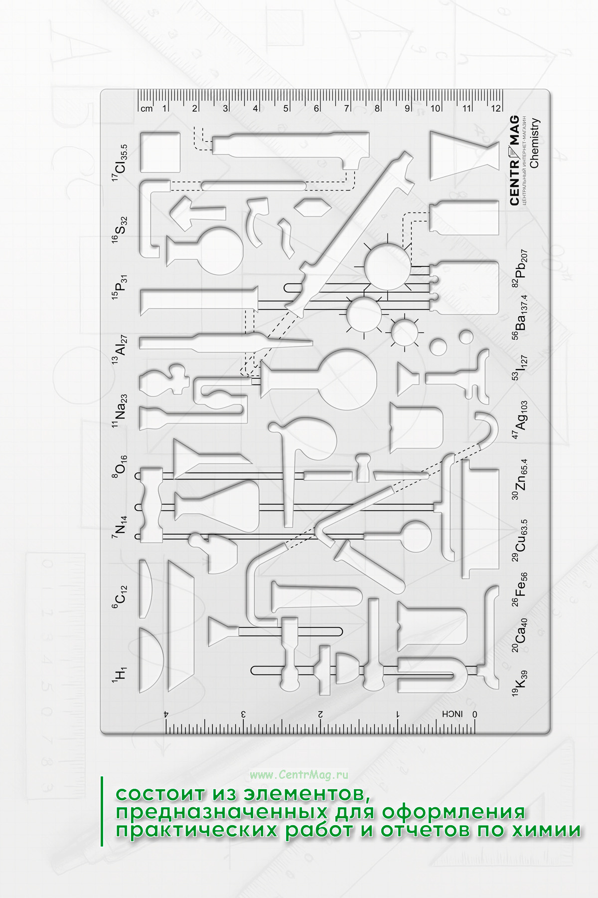 Линейка-трафарет состоит из большого количества необходимых элементов, предназначенных для оформления практических работ и отчетов по химии