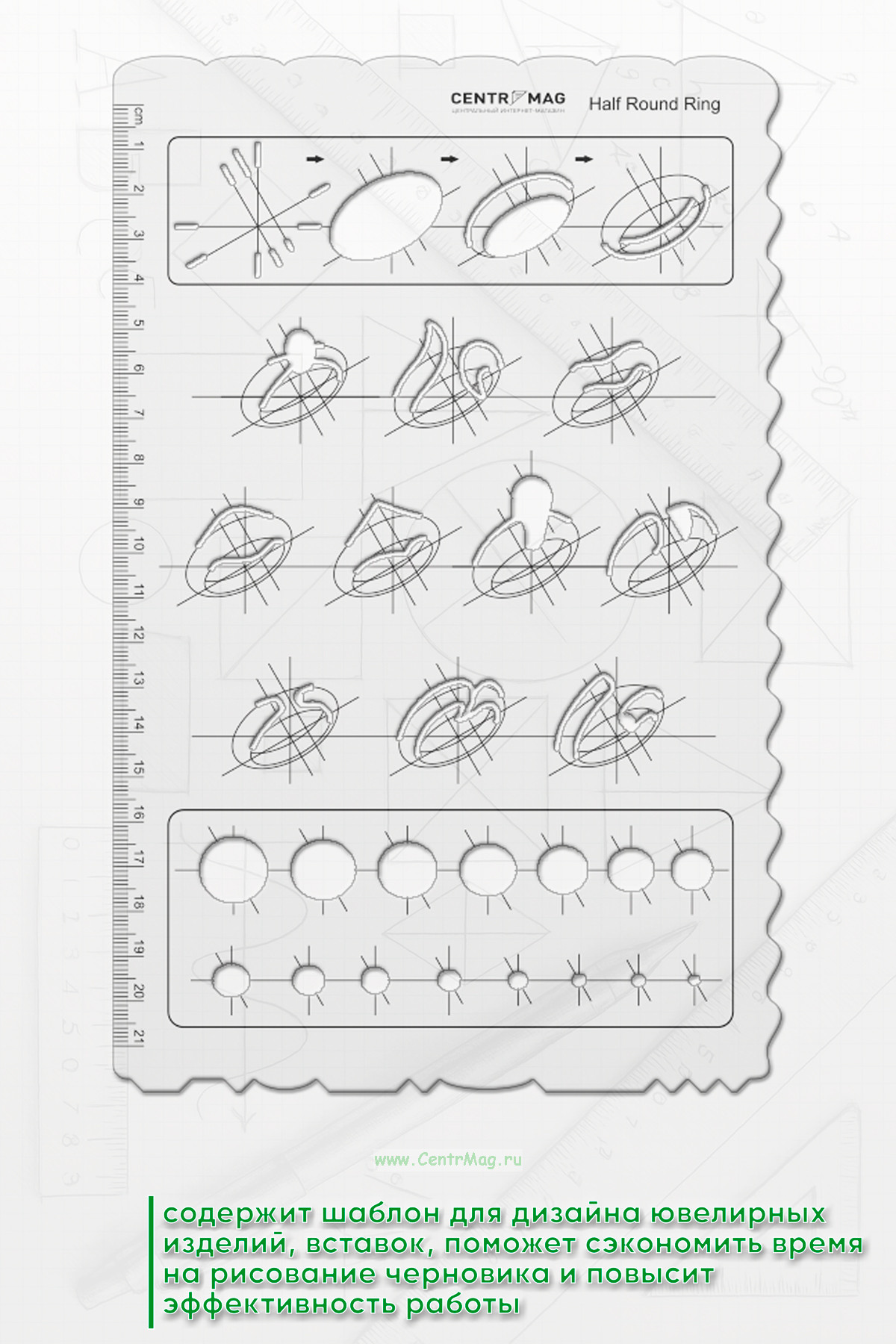 Линейка-трафарет содержит шаблон для дизайна ювелирных изделий, вставок. Поможет сэкономить время на рисование черновика и повысит эффективность работы. Возможно использовать во многих сферах искусства, а также для рисования фигур на различных поверхностях