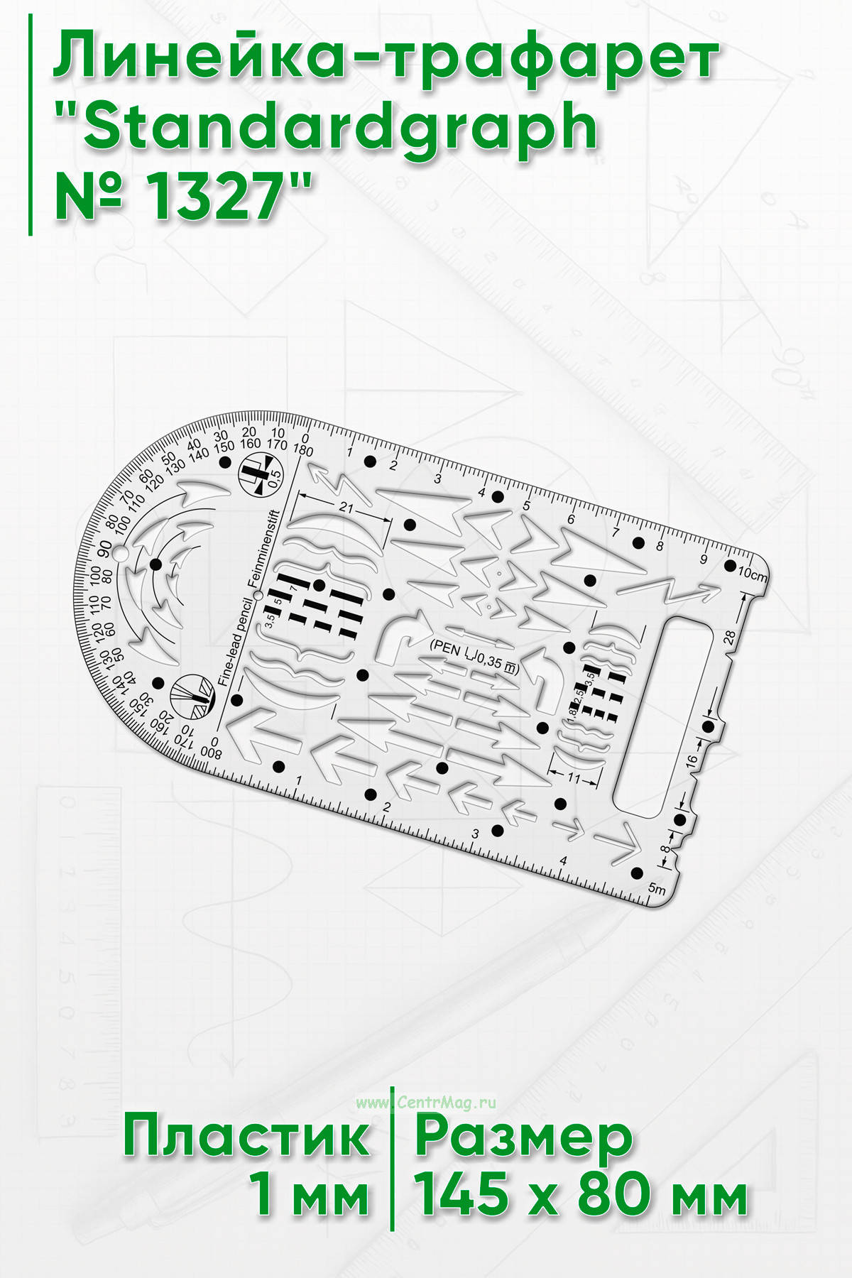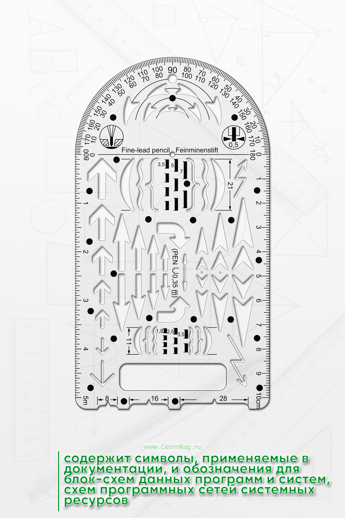 Линейка-трафарет содержит символы, применяемые в документации, и обозначения для блок-схем данных программ и систем, схем программных сетей системных ресурсов