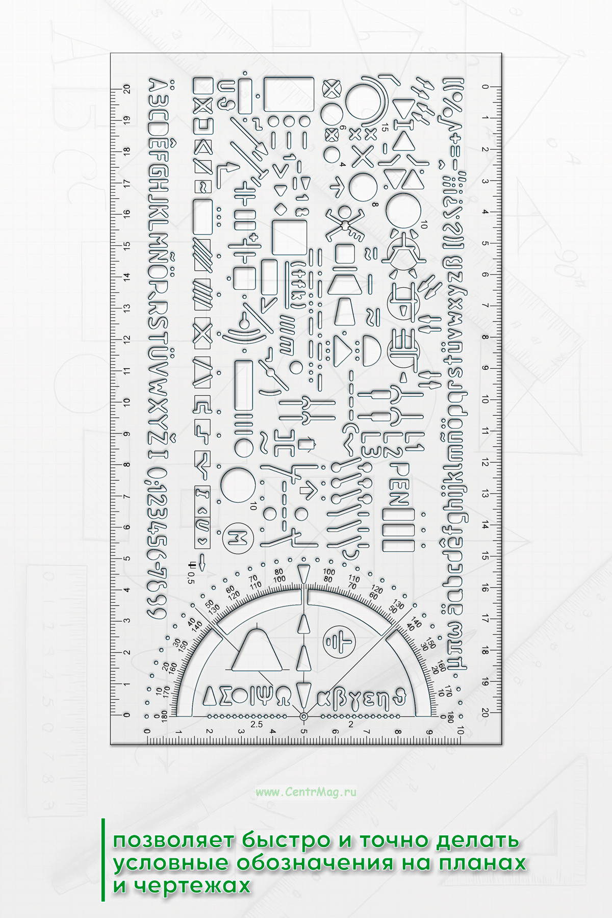 Трафарет позволяет быстро и точно делать условные обозначения на планах и чертежах