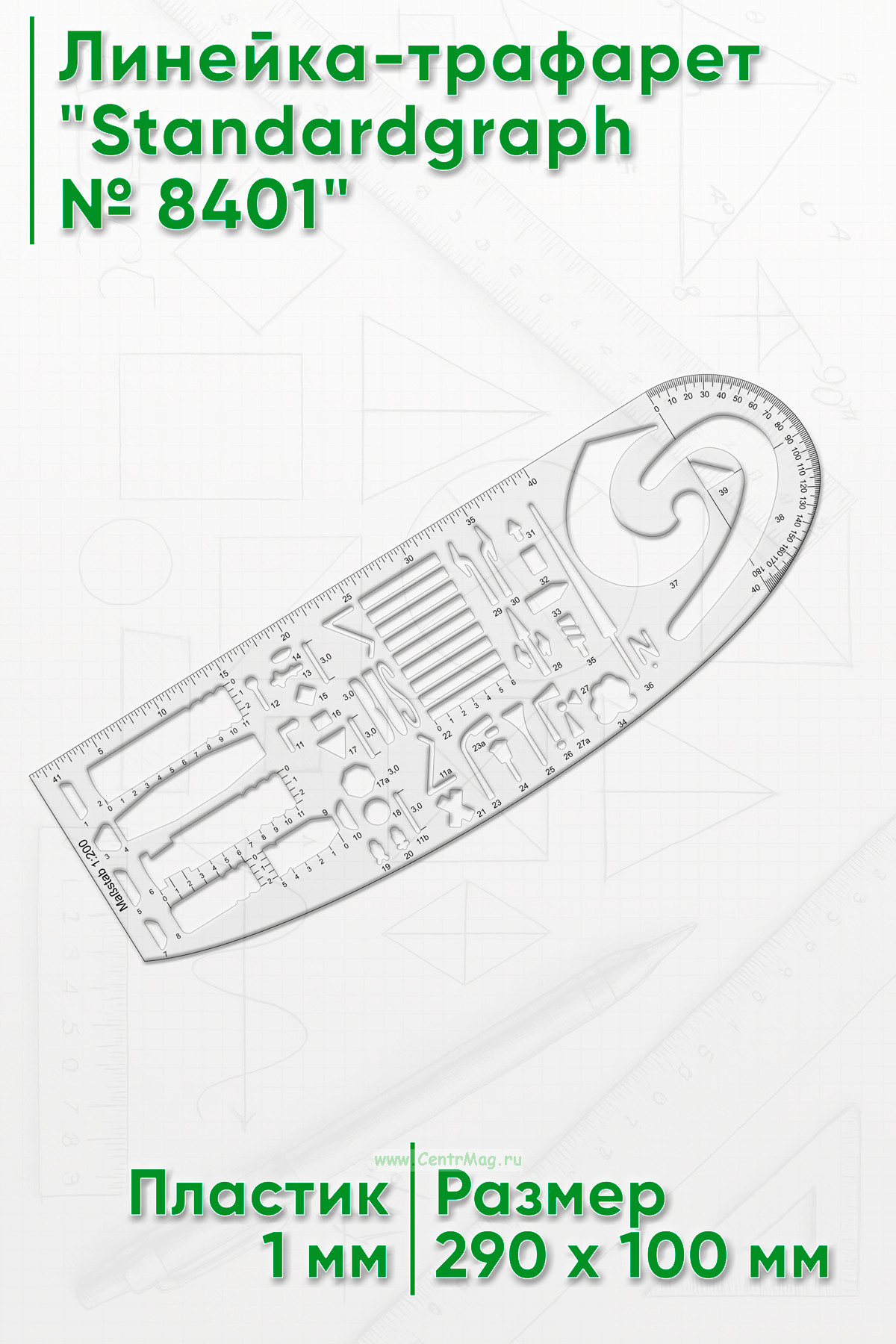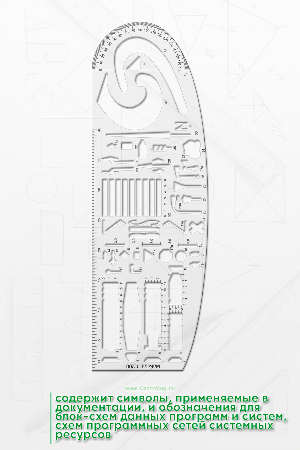 Линейка-трафарет содержит символы, применяемые в документации, и обозначения для блок-схем данных программ и систем, схем программных сетей системных ресурсов