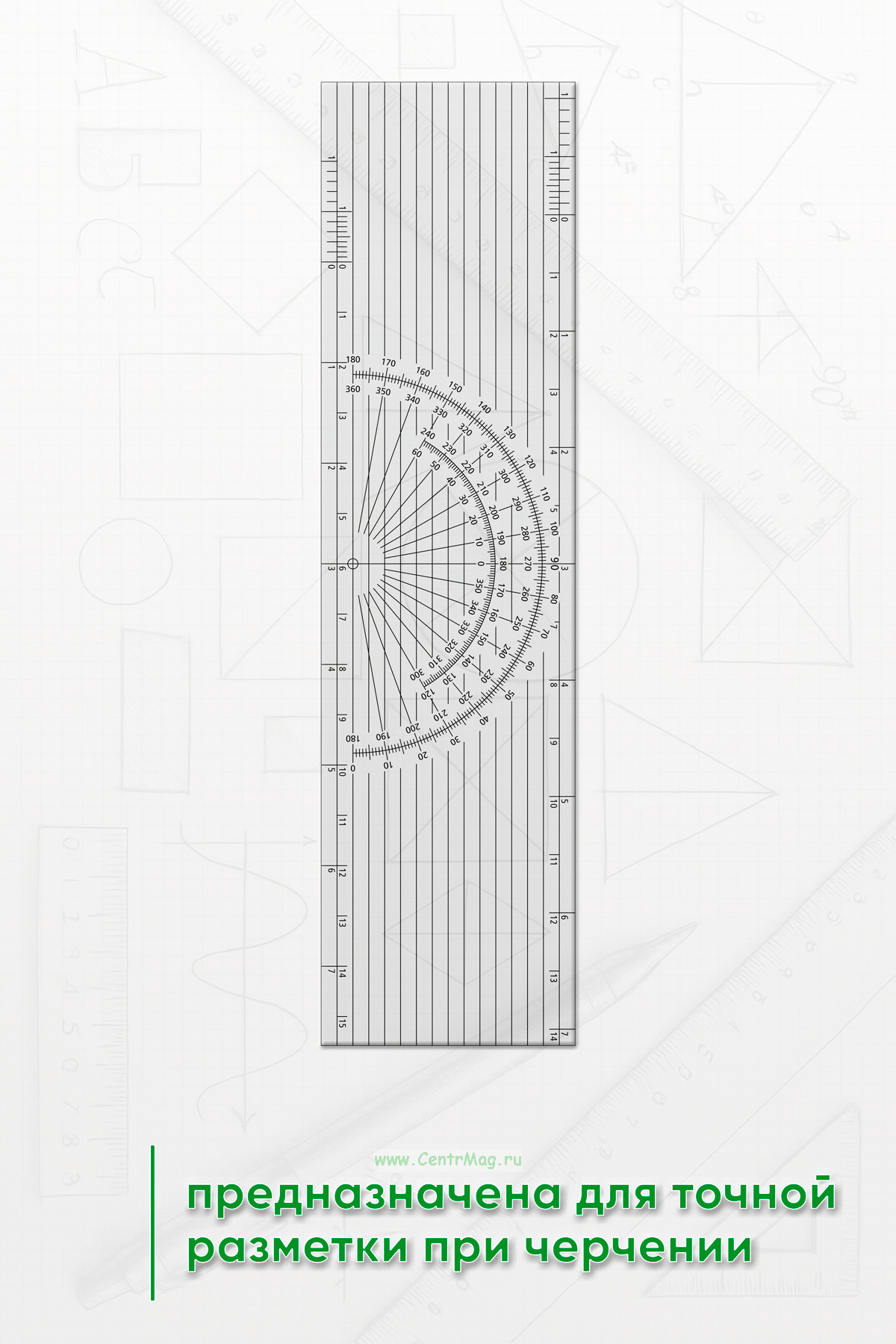 Линейка-транспортир предназначена для измерения и построения углов, а также проведения точной разметки при черчении. Широко применяется в архитектуре, инженерии и учебной практике.