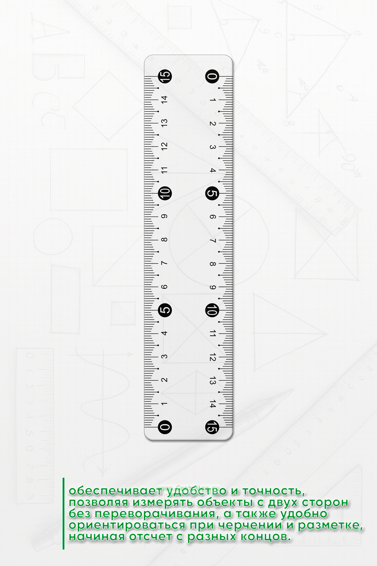 Линейка с двумя шкалами с одинаковыми единицами измерения обеспечивают удобство и точность, позволяя измерять объекты с двух сторон без переворачивания, а также удобно ориентироваться при черчении и разметке, начиная отсчет с разных концов.