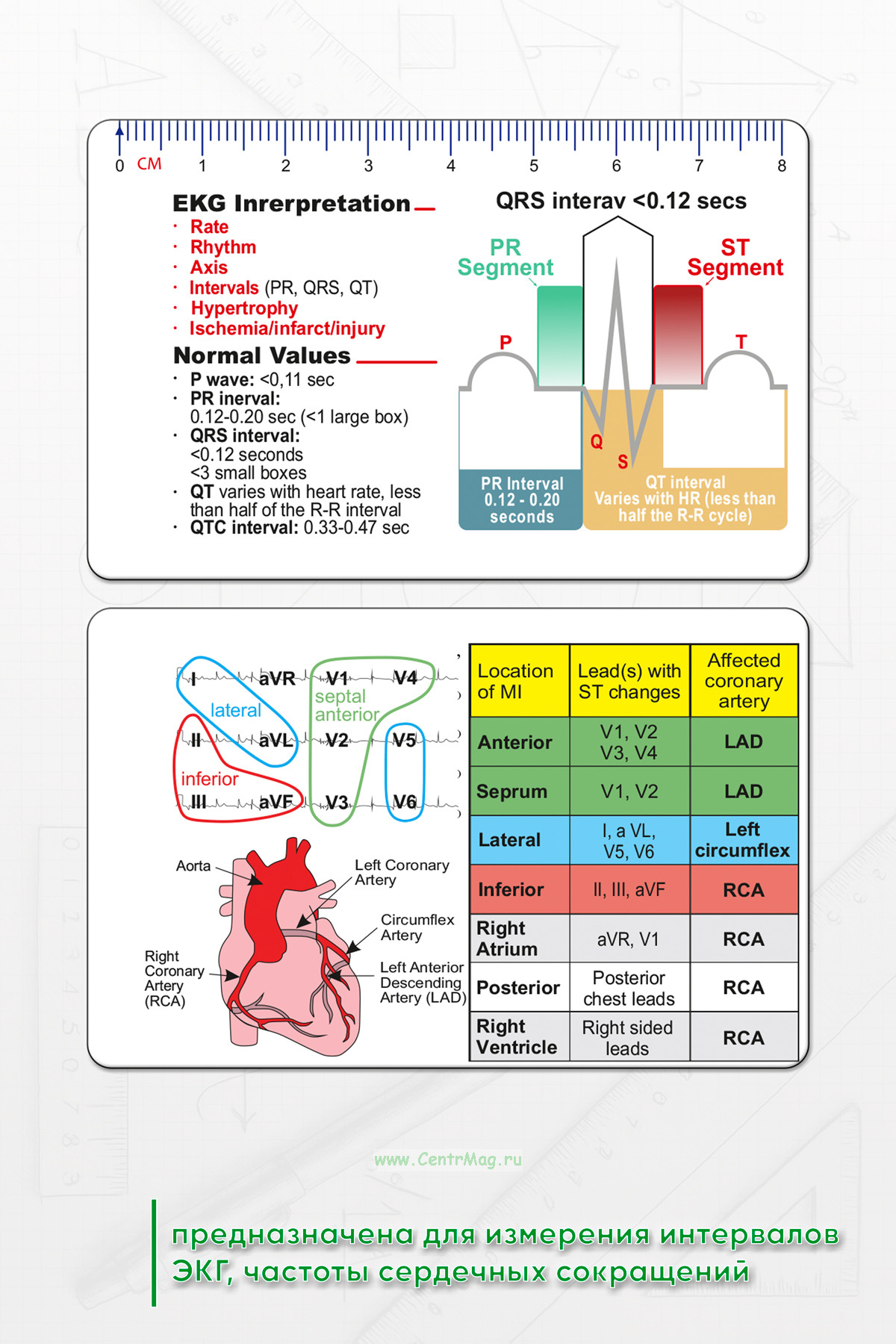Линейка предназначена для измерения интервалов ЭКГ, частоты сердечных сокращений.