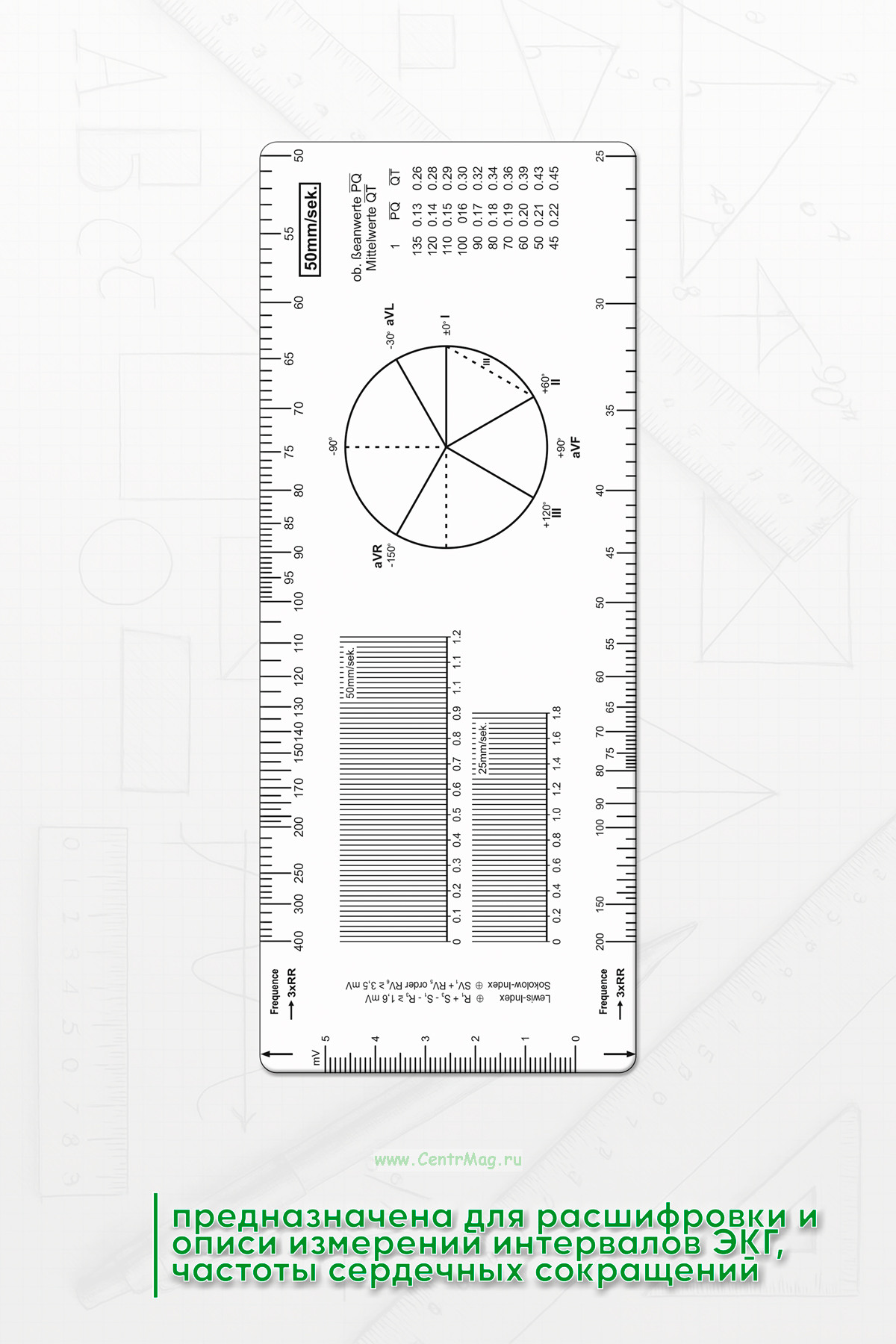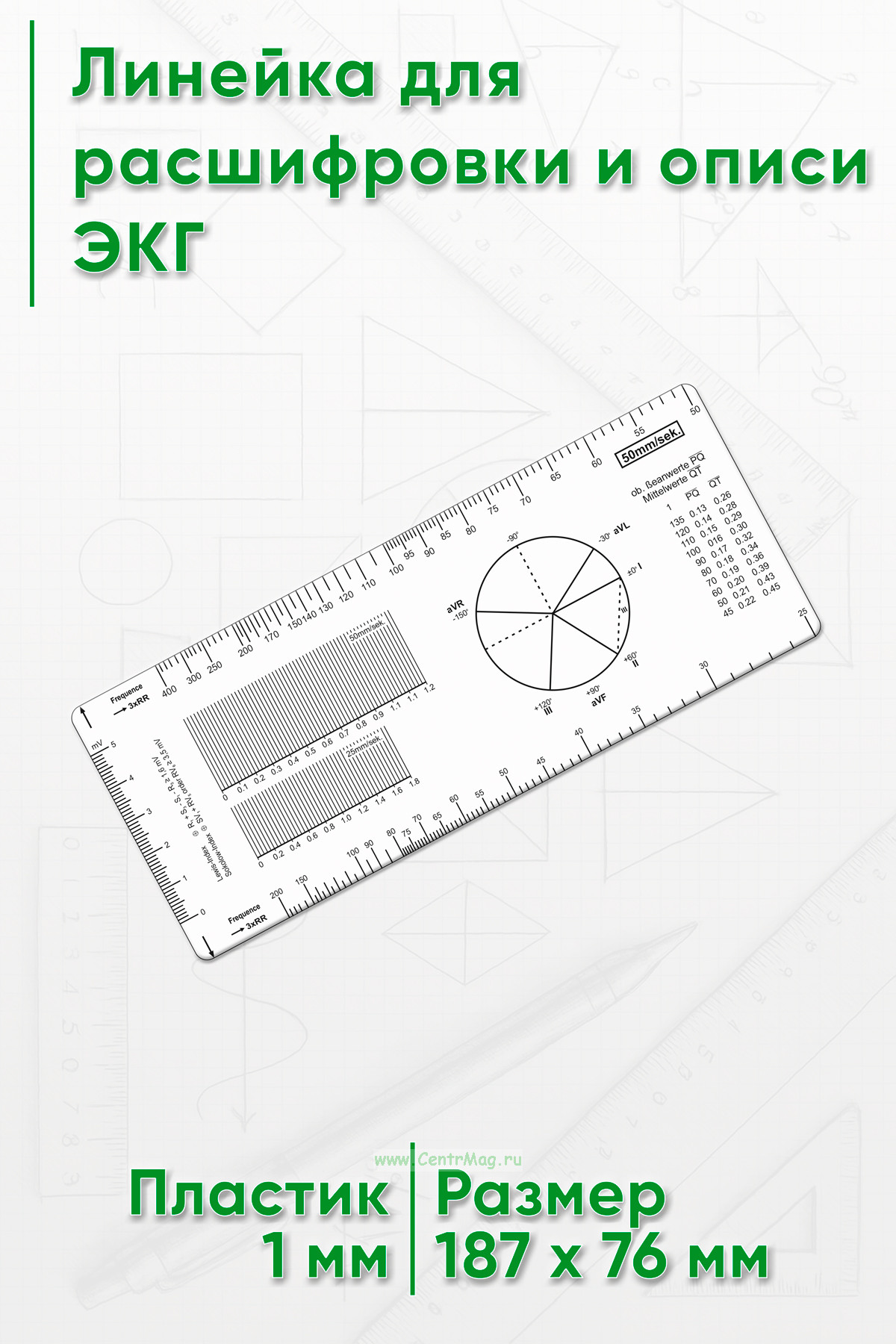 Линейка предназначена для расшифровки и описи измерений интервалов ЭКГ, частоты сердечных сокращений.