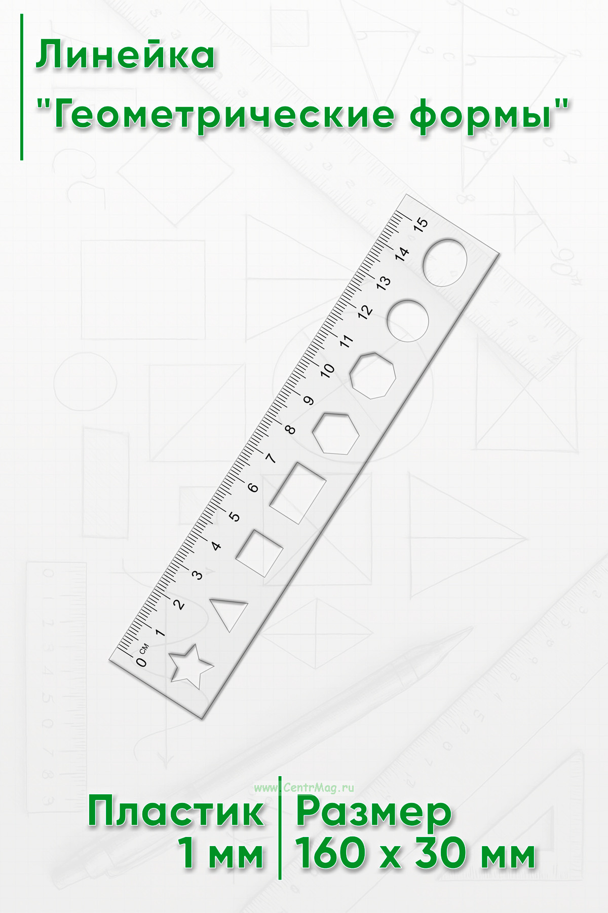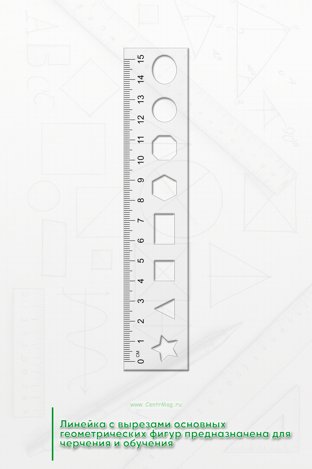 Линейка "Геометрические формы" с вырезами основных геометрических фигур предназначена для черчения и обучения. Обеспечивает удобство использования и точность измерений.