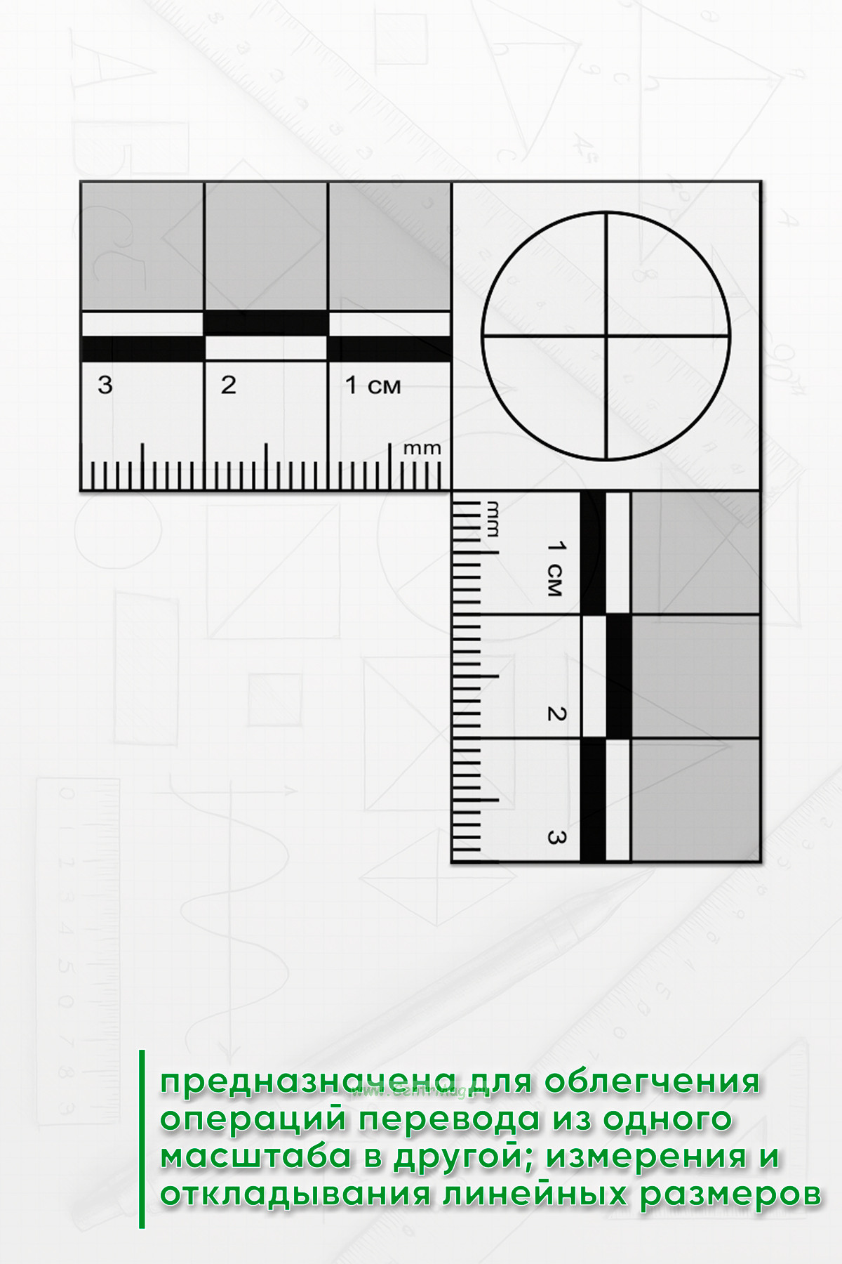 Линейка предназначена для облегчения операций перевода из одного масштаба в другой; измерения и откладывания линейных размеров, так же используется при фото-видеосъемке повреждений и улик на местах происшествий