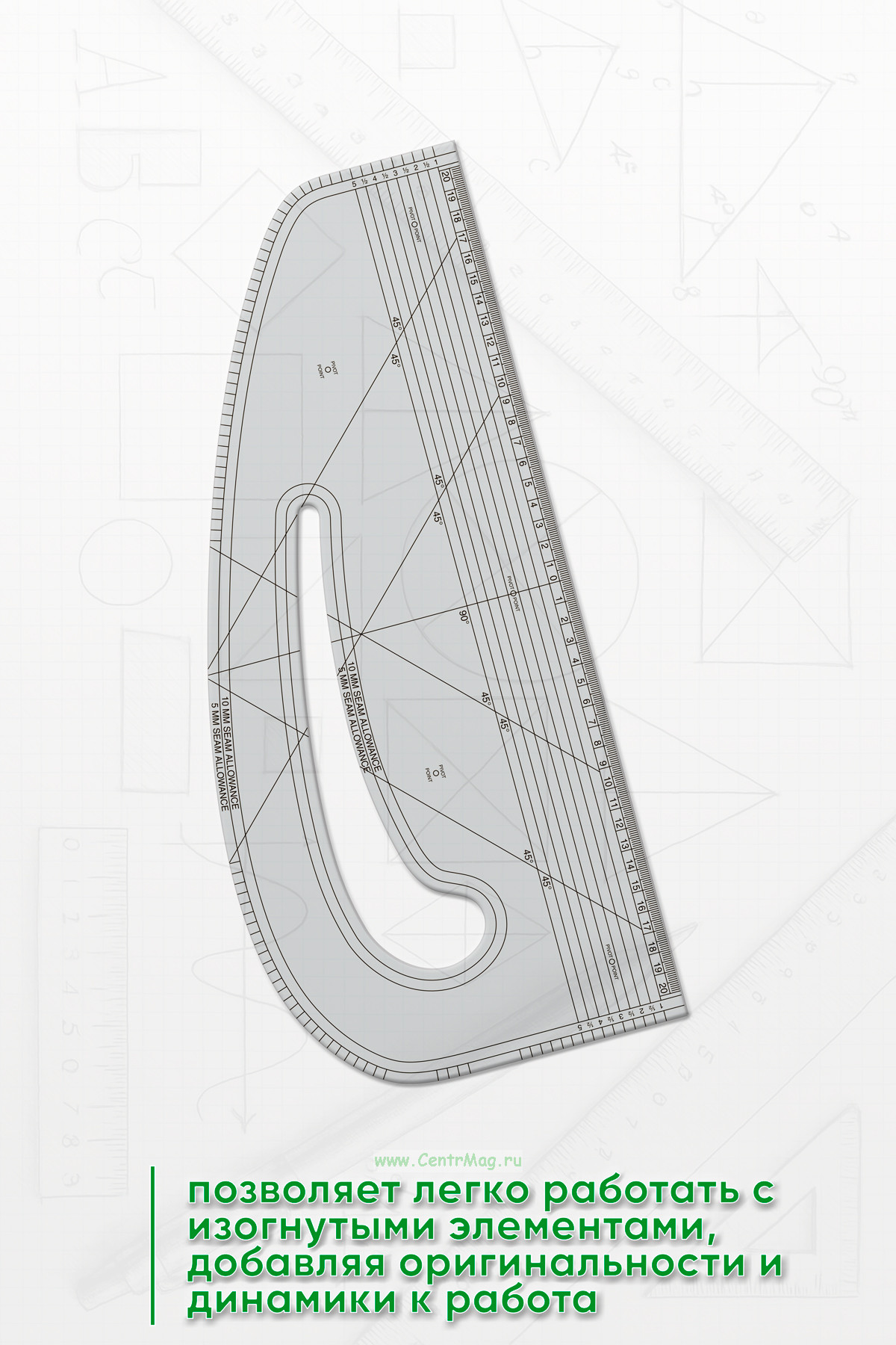 Линейка "Кривой шаблон" предназначена для создания необычных, асимметричных линий и кривых, которые можно использовать в художественных и дизайнерских проектах. Она позволяет легко работать с изогнутыми элементами, добавляя оригинальности и динамики к работам.