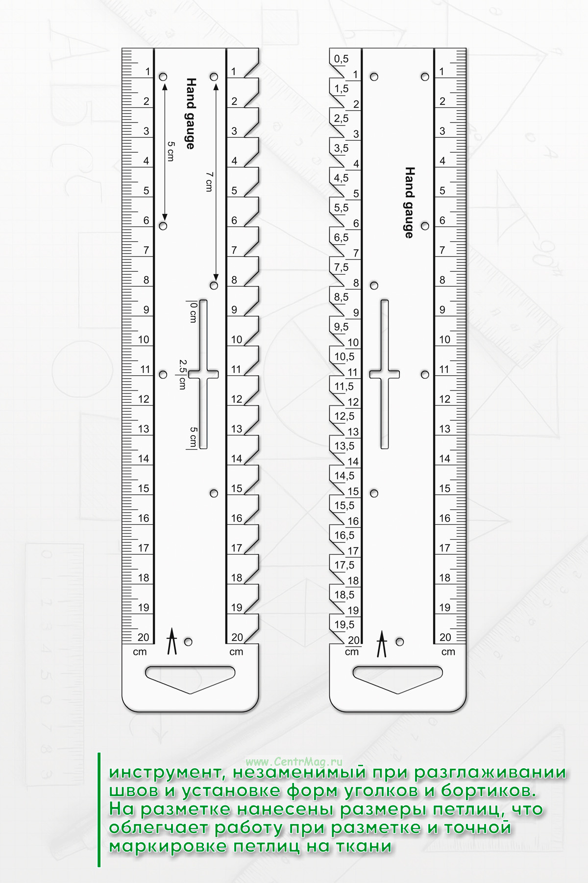 Универсальный портняжный инструмент, незаменимый при разглаживании швов и установке форм уголков и бортиков. На разметке нанесены размеры петлиц, что облегчает работу при разметке и точной маркировке петлиц на ткани