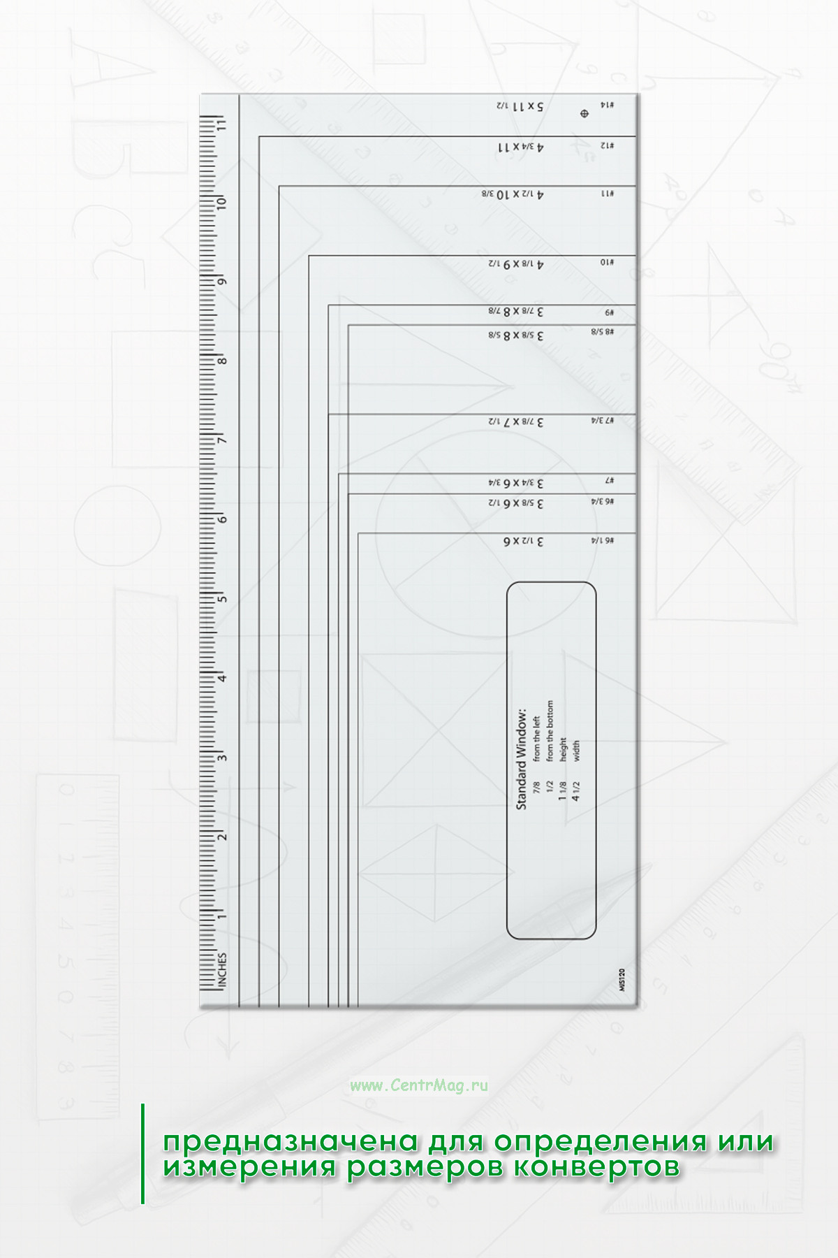 Линейка "Размер конверта" предназначена для определения или измерения размеров конвертов. Линейка имеет нанесённые стандартные размеры популярных форматов конвертов