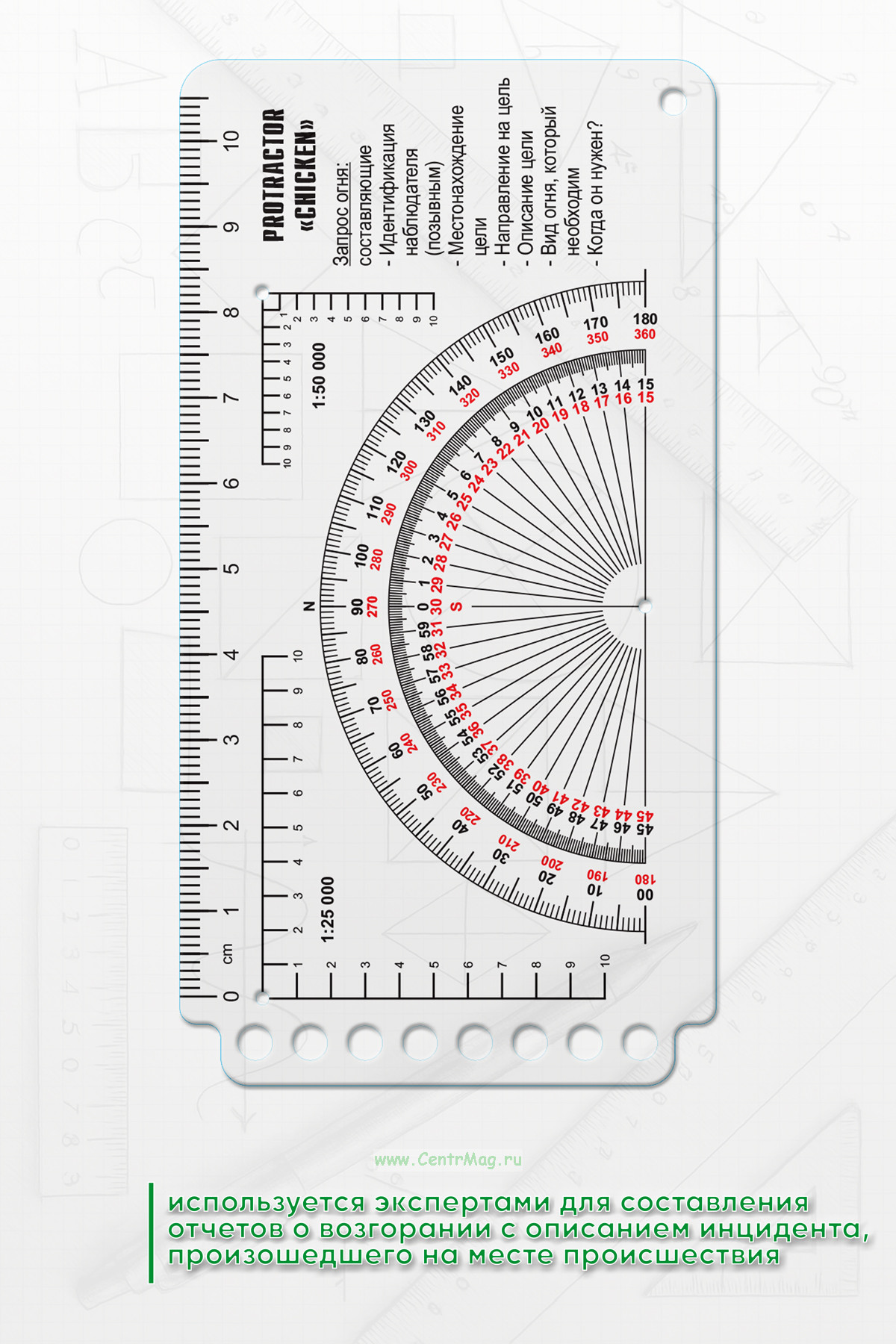 Линейка используется экспертами для составления отчетов о возгорании с описанием инцидента, произошедшего на месте происшествия. На линейке есть краткая инструкция