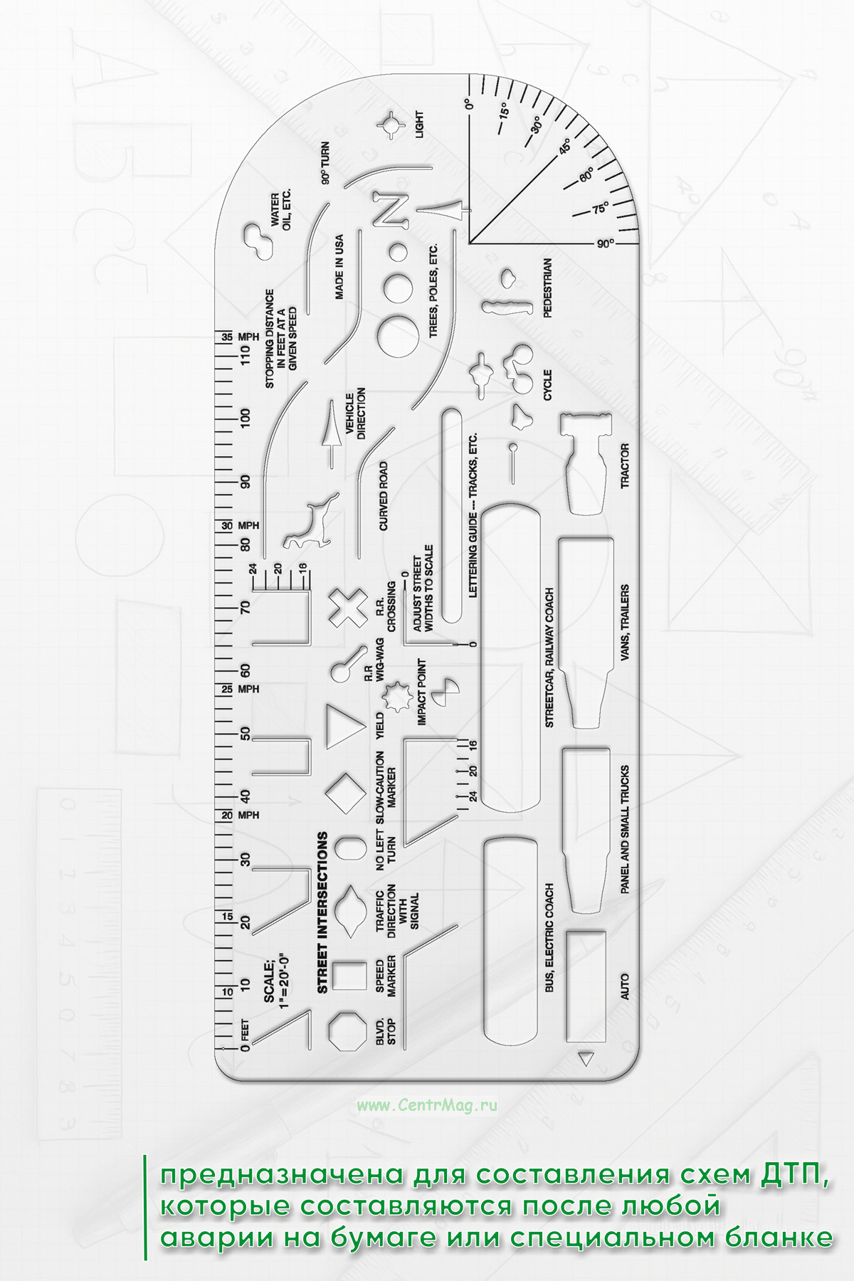 Линейка предназначена для составления схем ДТП, которые составляются после любой аварии на бумаге или специальном бланке. Она будет полезна инспекторам ГИБДД, дежурным следователям, водителям