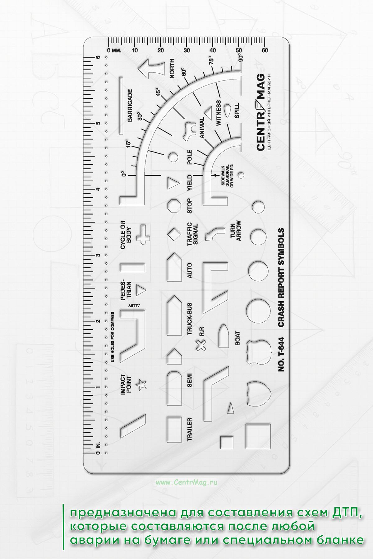 Линейка предназначена для составления схем ДТП, которые составляются после любой аварии на бумаге или специальном бланке. Она будет полезна инспекторам ГИБДД, дежурным следователям, водителям