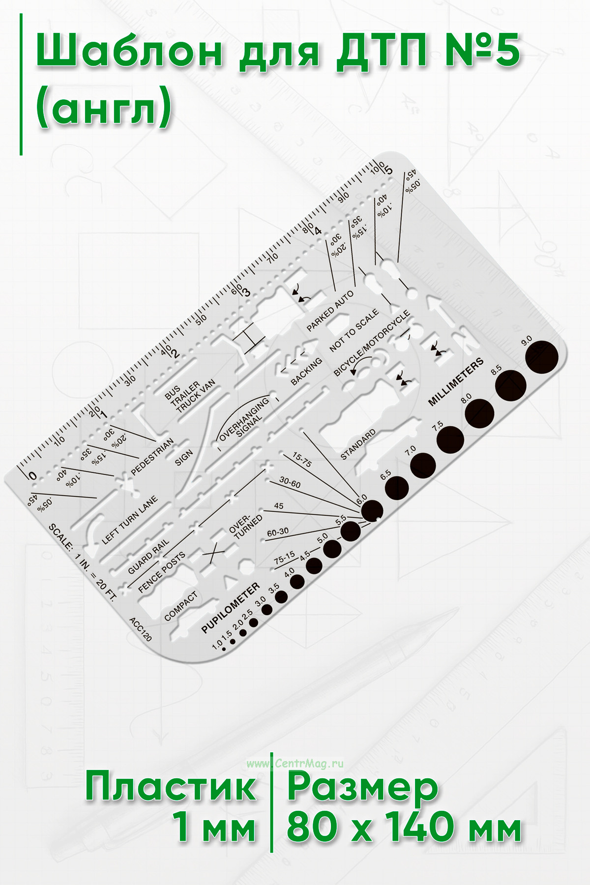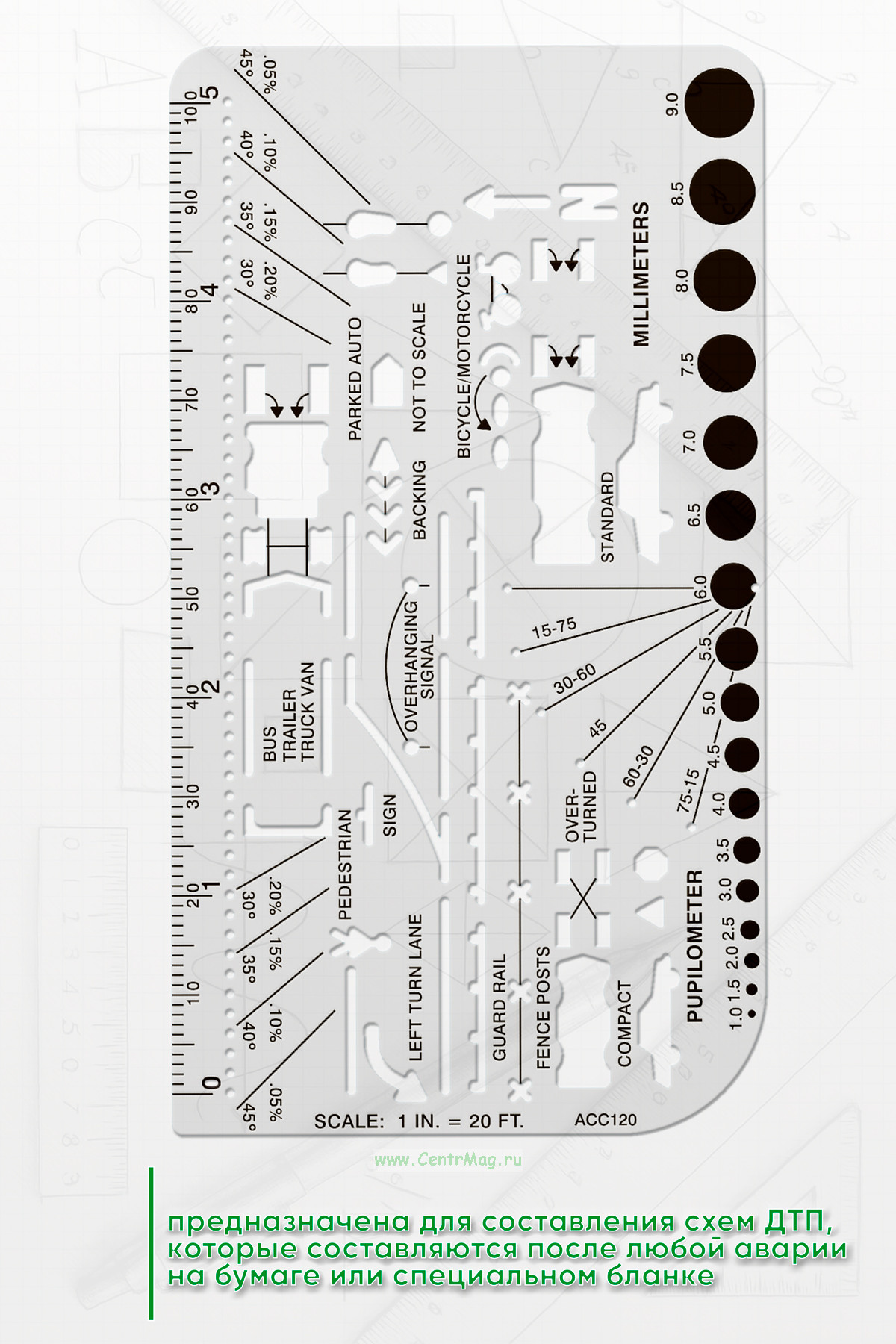 Линейка предназначена для составления схем ДТП, которые составляются после любой аварии на бумаге или специальном бланке. Она будет полезна инспекторам ГИБДД, дежурным следователям, водителям
