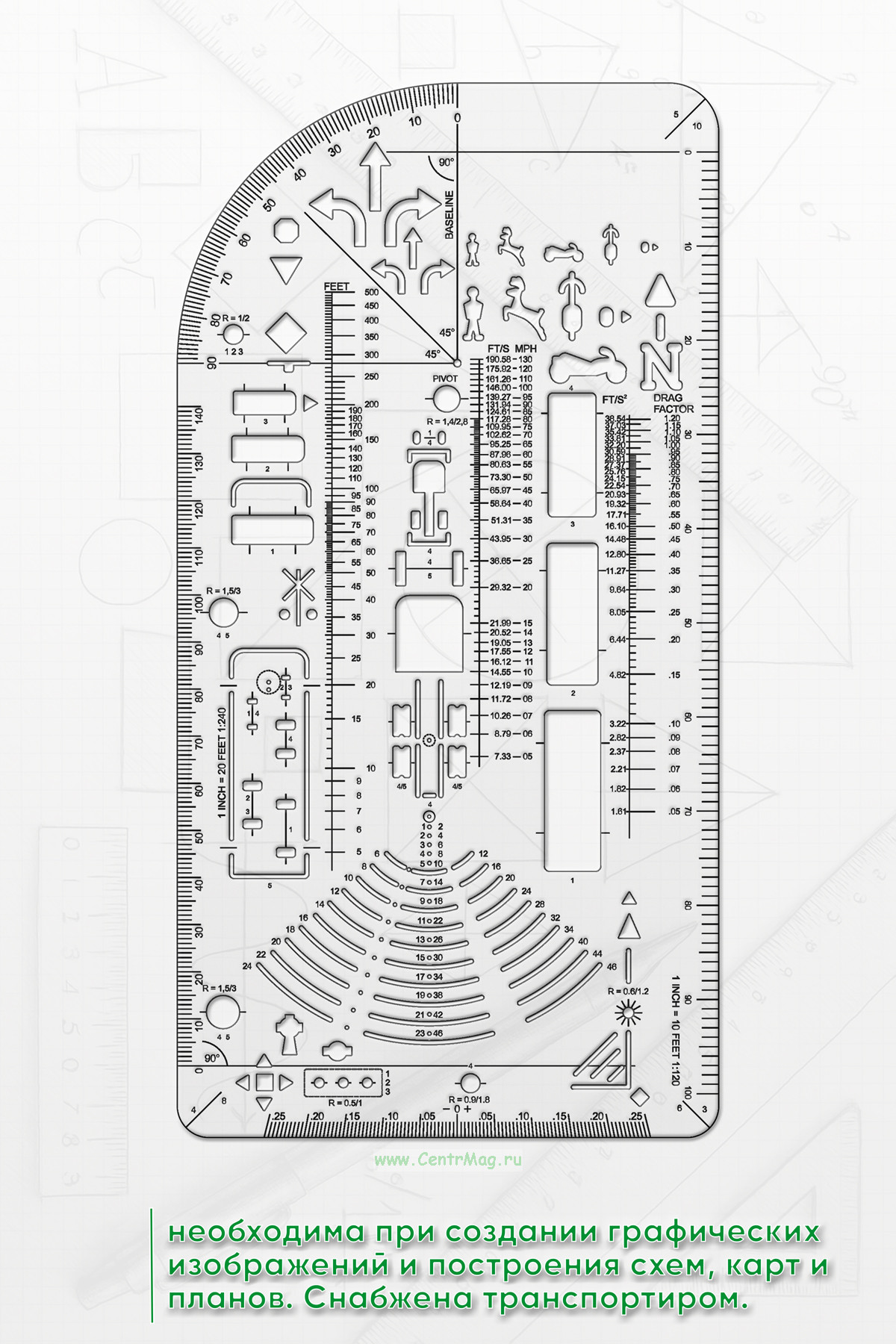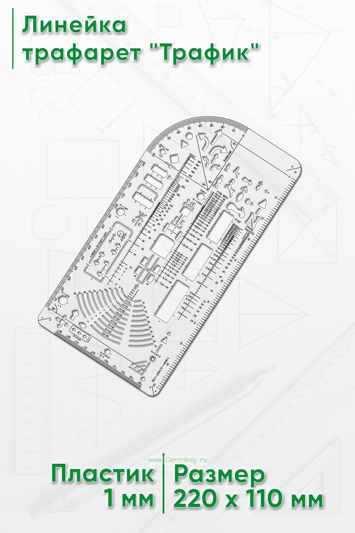 Линейка-трафарет необходима при создании графических изображений и построения схем, карт и планов. Снабжена транспортиром.