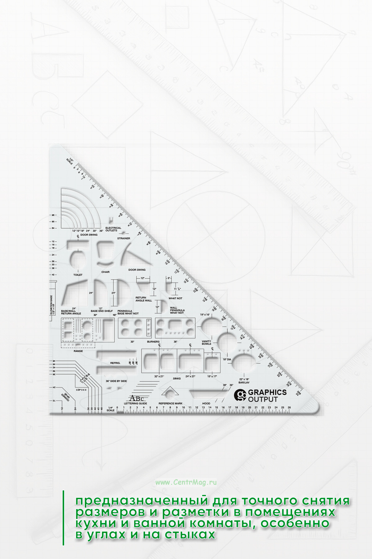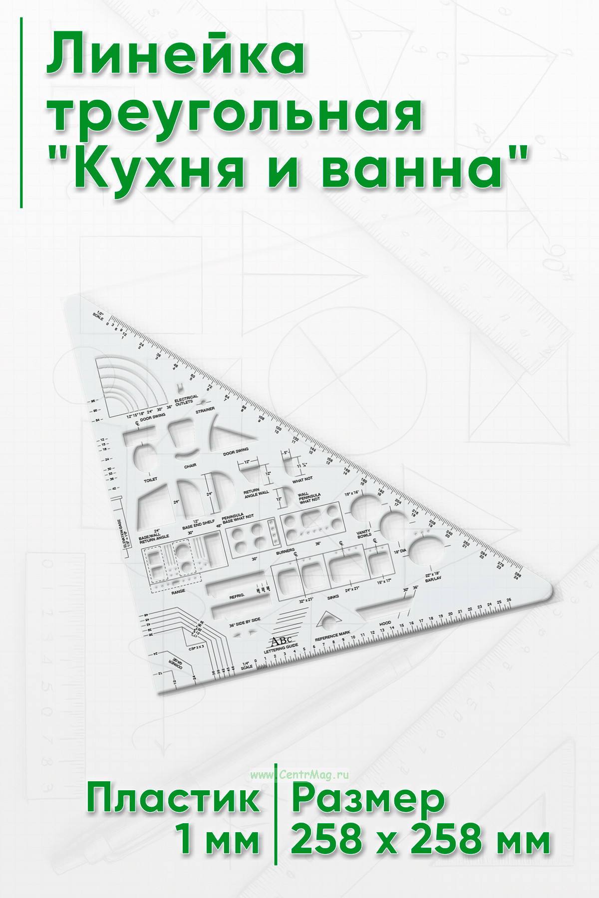 Линейка треугольная "Кухня и ванна" — это специализированный измерительный инструмент, предназначенный для точного снятия размеров и разметки в помещениях кухни и ванной комнаты, особенно в углах и на стыках.