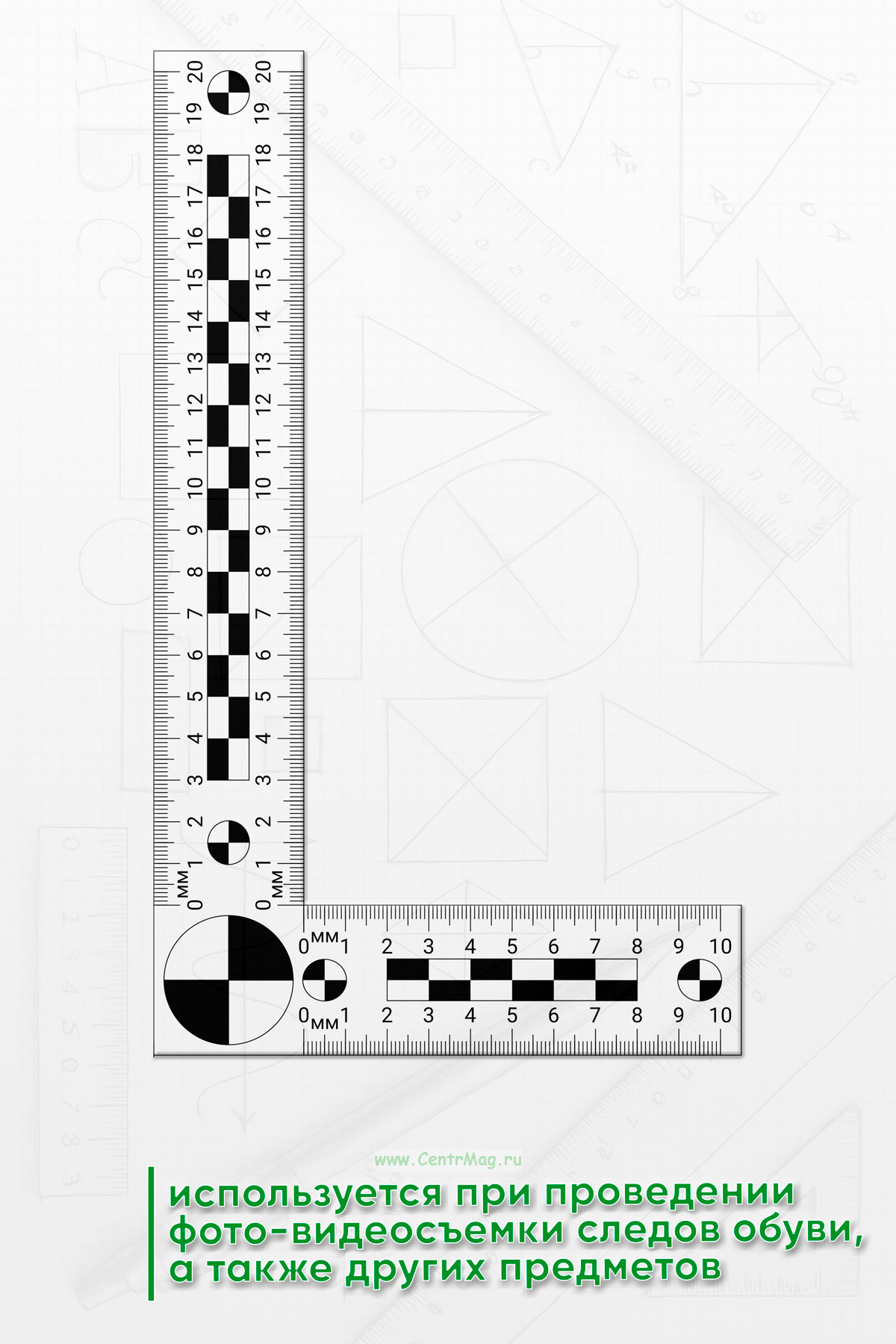Линейка угловая используется при проведении фото-видеосъемки следов обуви, а также других предметов и улик при осмотрах мест происшествий.
