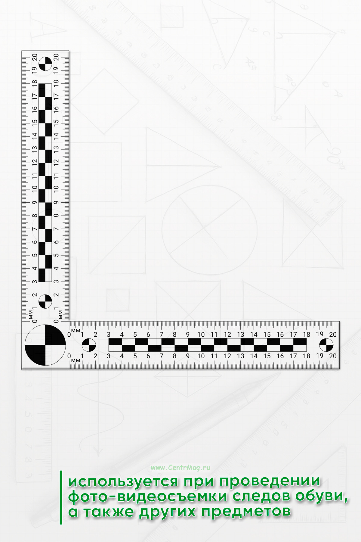 Линейка угловая используется при проведении фото-видеосъемки следов обуви, а также других предметов и улик при осмотрах мест происшествий