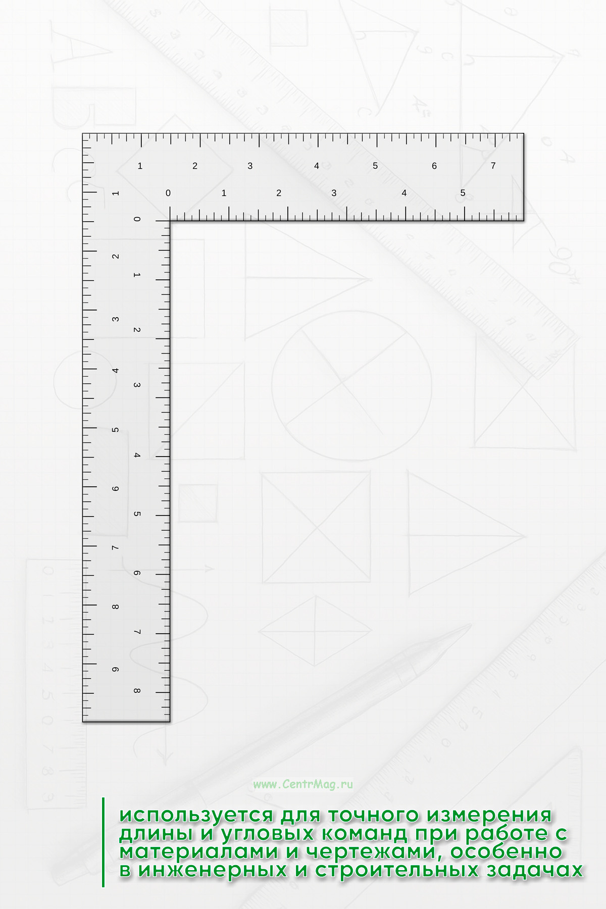 Линейка-угольник в дюймах используется для точного измерения длины и угловых команд при работе с материалами и чертежами, особенно в инженерных и строительных задачах. Она сочетает в себе функцию измерительного инструмента и угольника, что удобно для выполнения многообразных замеров и разметки.