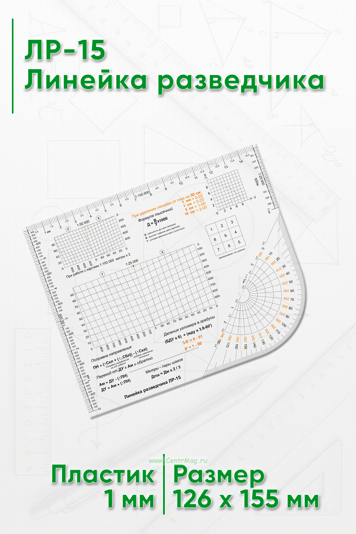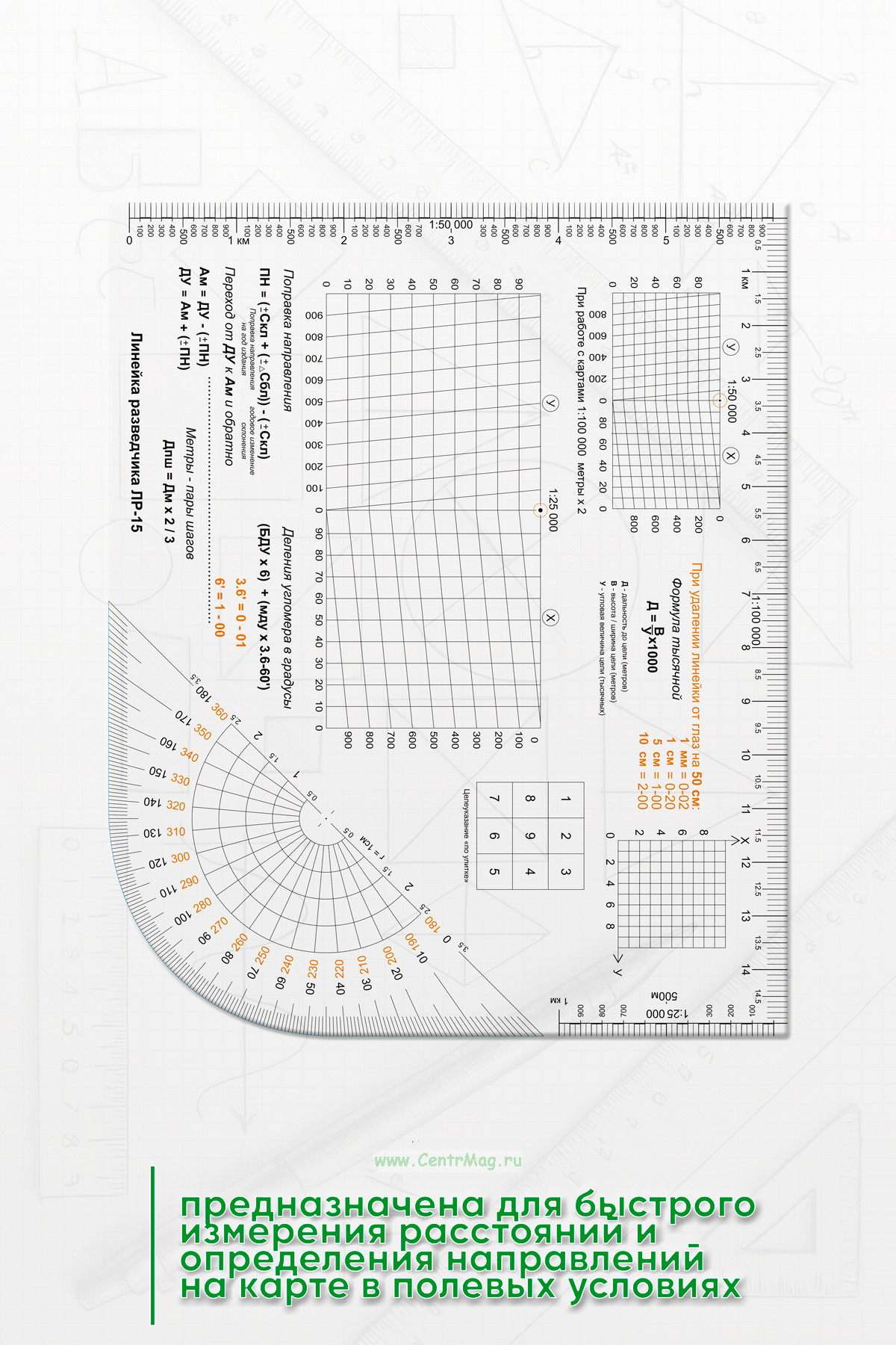 Линейка разведчика предназначена для быстрого измерения расстояний и определения направлений на карте в полевых условиях. Она облегчает ориентирование и планирование действий разведывательных подразделений.