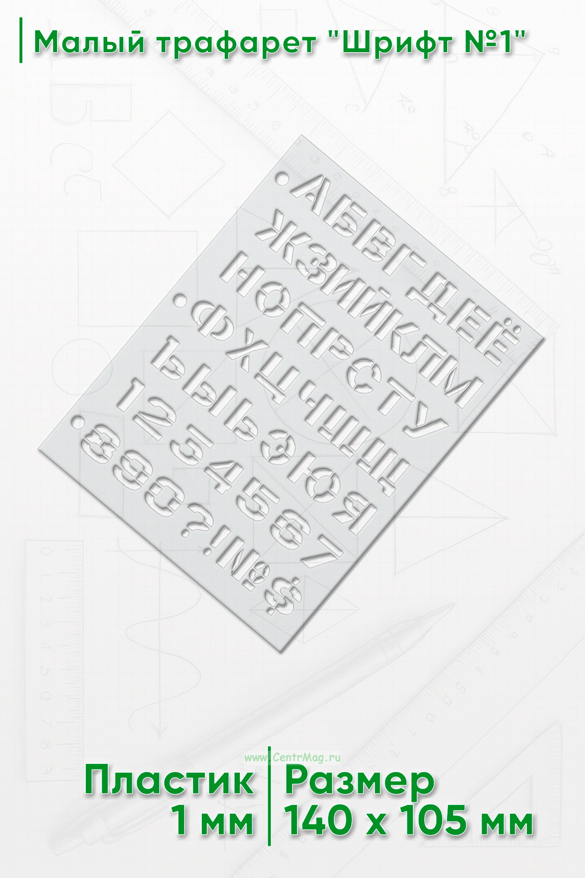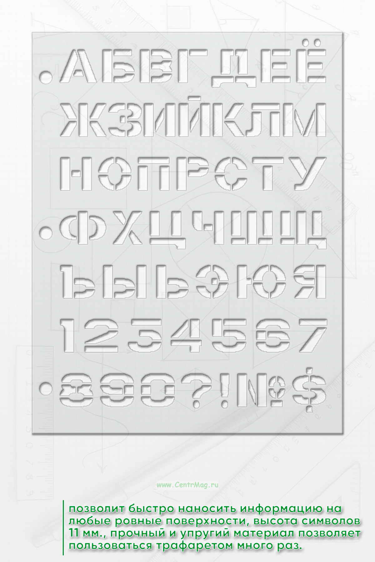 Трафарет позволит быстро наносить информацию на любые ровные поверхности. Высота символов 11 мм. Прочный и упругий материал позволяет пользоваться трафаретом много раз. Отверстия сбоку позволяют прикрепить один или несколько трафаретов к планшету или папке.
