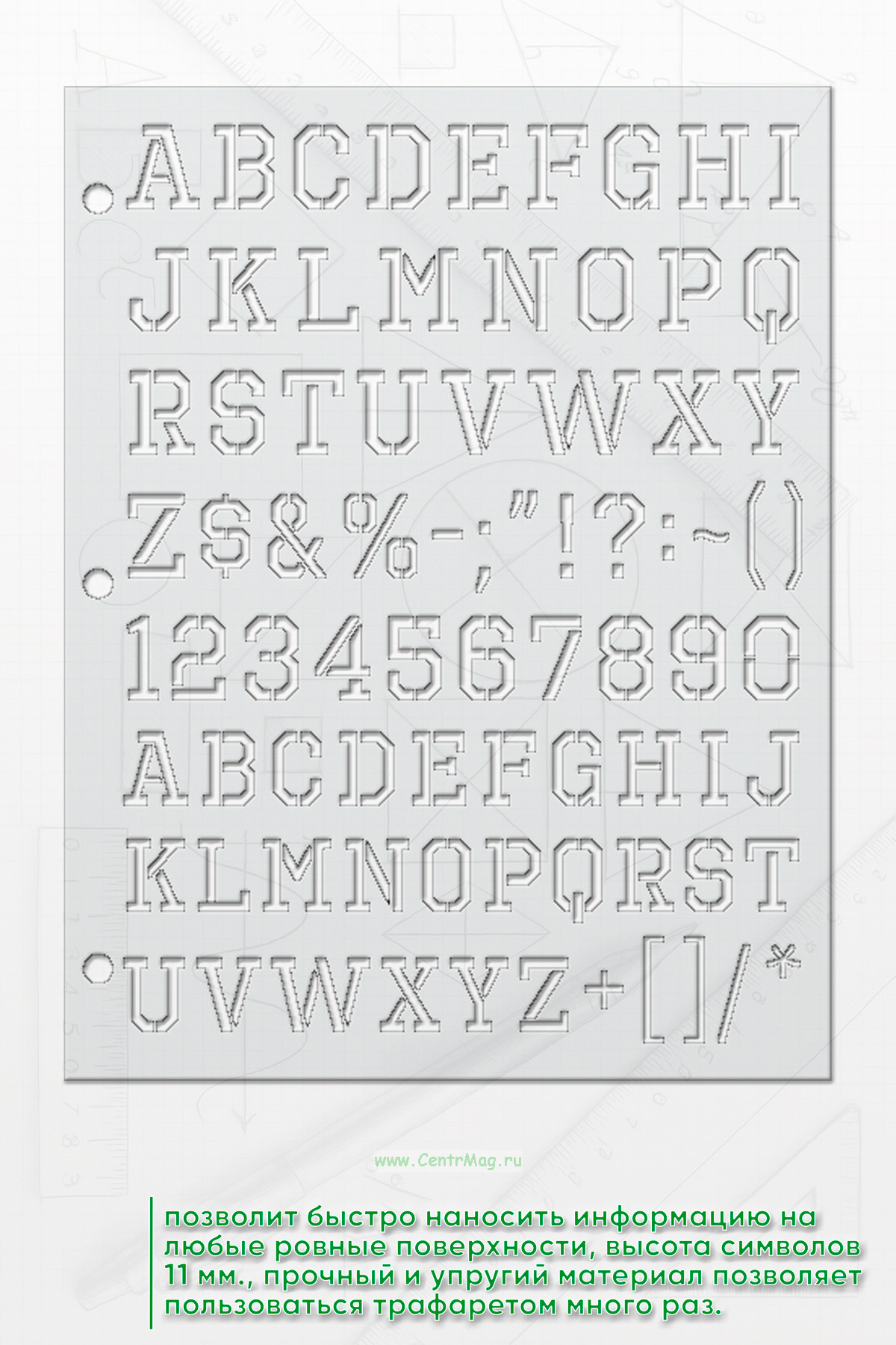 Трафарет позволит быстро наносить информацию на любые ровные поверхности. Высота символов 11 мм. Прочный и упругий материал позволяет пользоваться трафаретом много раз. Отверстия сбоку позволяют прикрепить один или несколько трафаретов к планшету или папке.