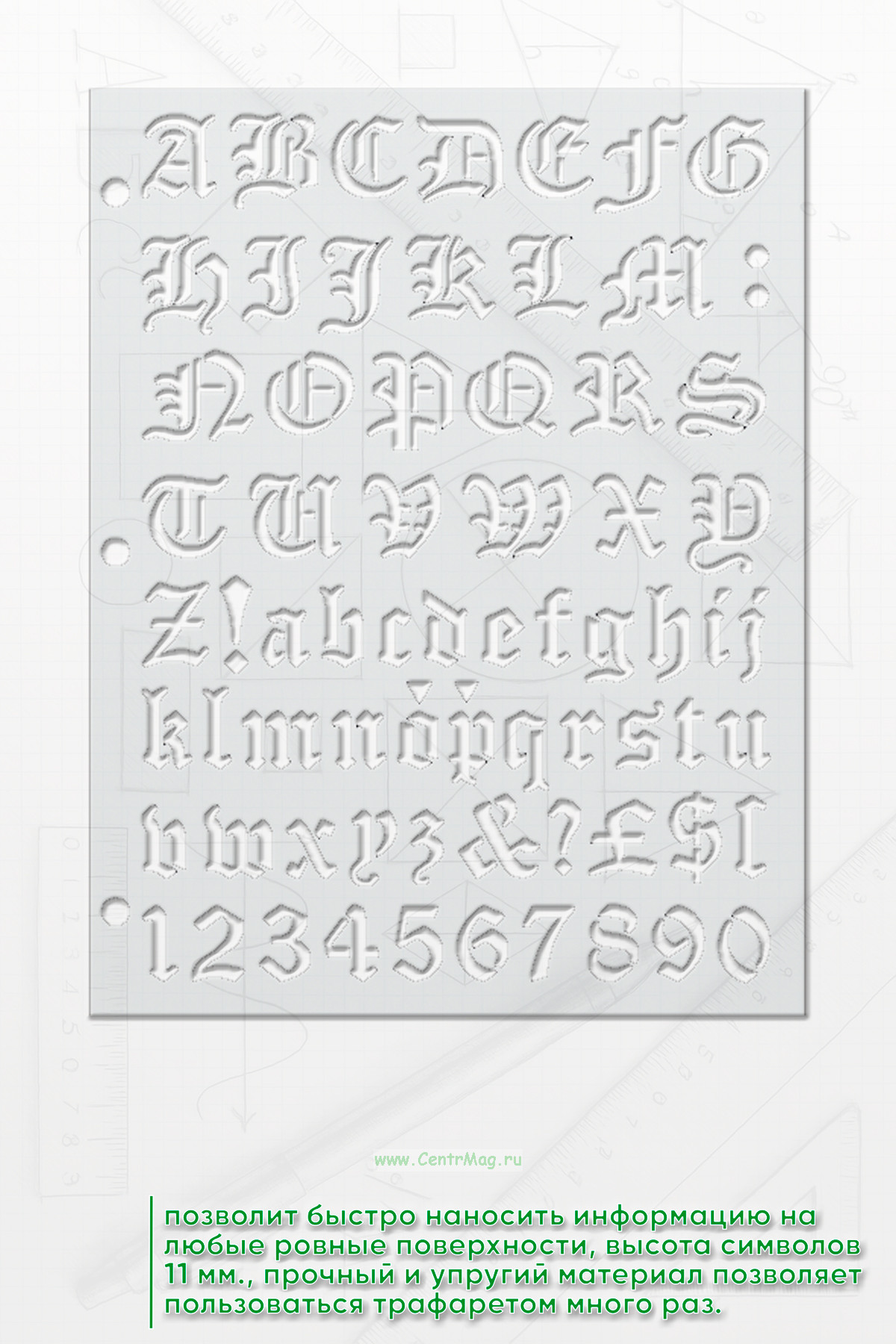 Трафарет позволит быстро наносить информацию на любые ровные поверхности. Высота высота символов 11 мм, Прочный и упругий материал позволяет пользоваться трафаретом много раз. Отверстия сбоку позволяют прикрепить один или несколько трафаретов к планшету или папке.