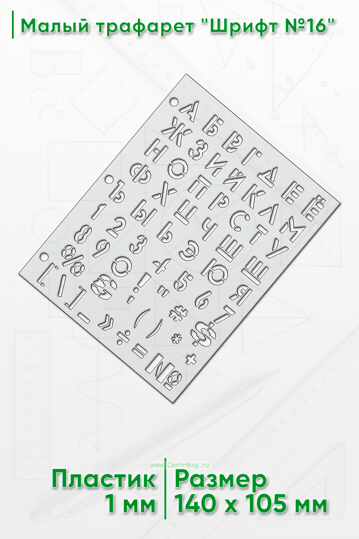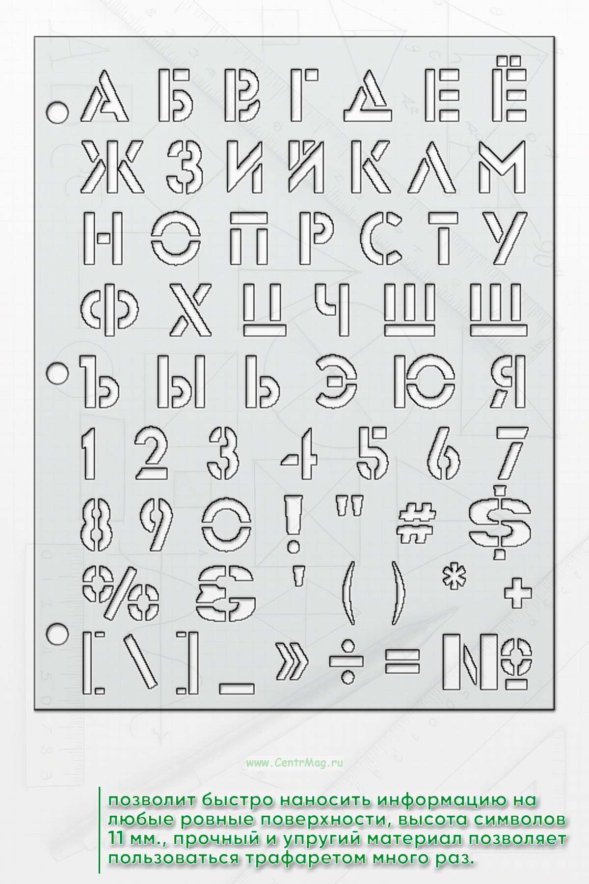 Трафарет позволит быстро наносить информацию на любые ровные поверхности. Высота символов 11 мм.Прочный и упругий материал позволяет пользоваться трафаретом много раз. Отверстия сбоку позволяют прикрепить один или несколько трафаретов к планшету или папке.