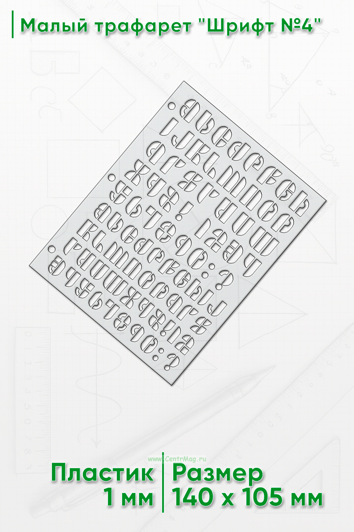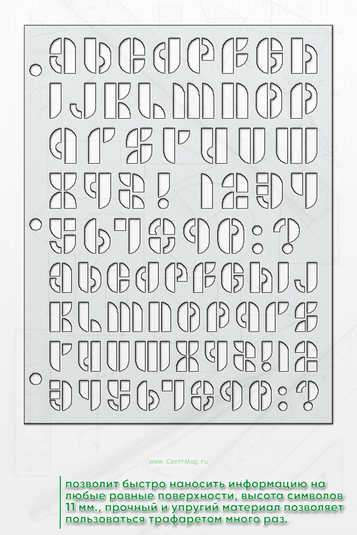 Трафарет позволит быстро наносить информацию на любые ровные поверхности. Высота символов 11 мм.Прочный и упругий материал позволяет пользоваться трафаретом много раз. Отверстия сбоку позволяют прикрепить один или несколько трафаретов к планшету или папке.