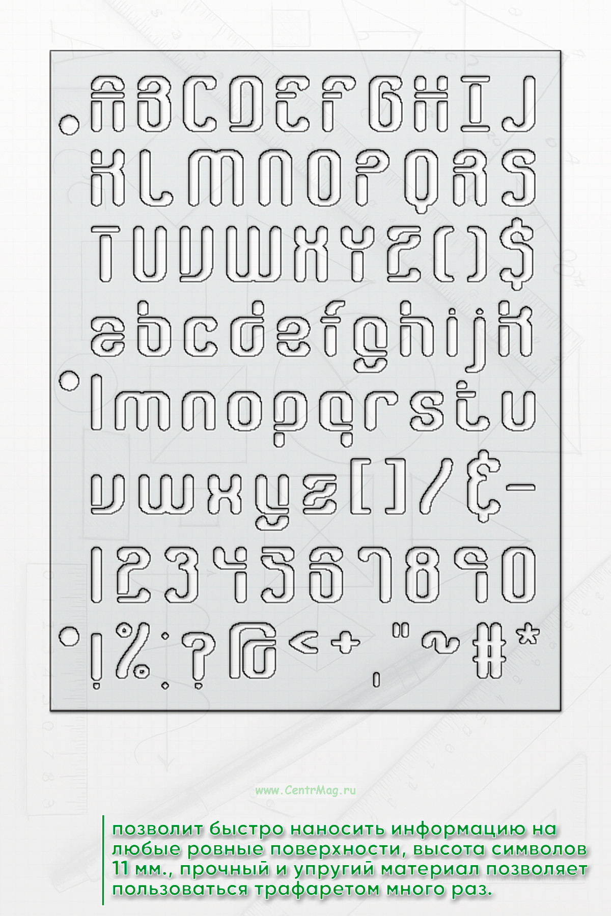Трафарет позволит быстро наносить информацию на любые ровные поверхности. Высота символов 11 мм, Прочный и упругий материал позволяет пользоваться трафаретом много раз. Отверстия сбоку позволяют прикрепить один или несколько трафаретов к планшету или папке.