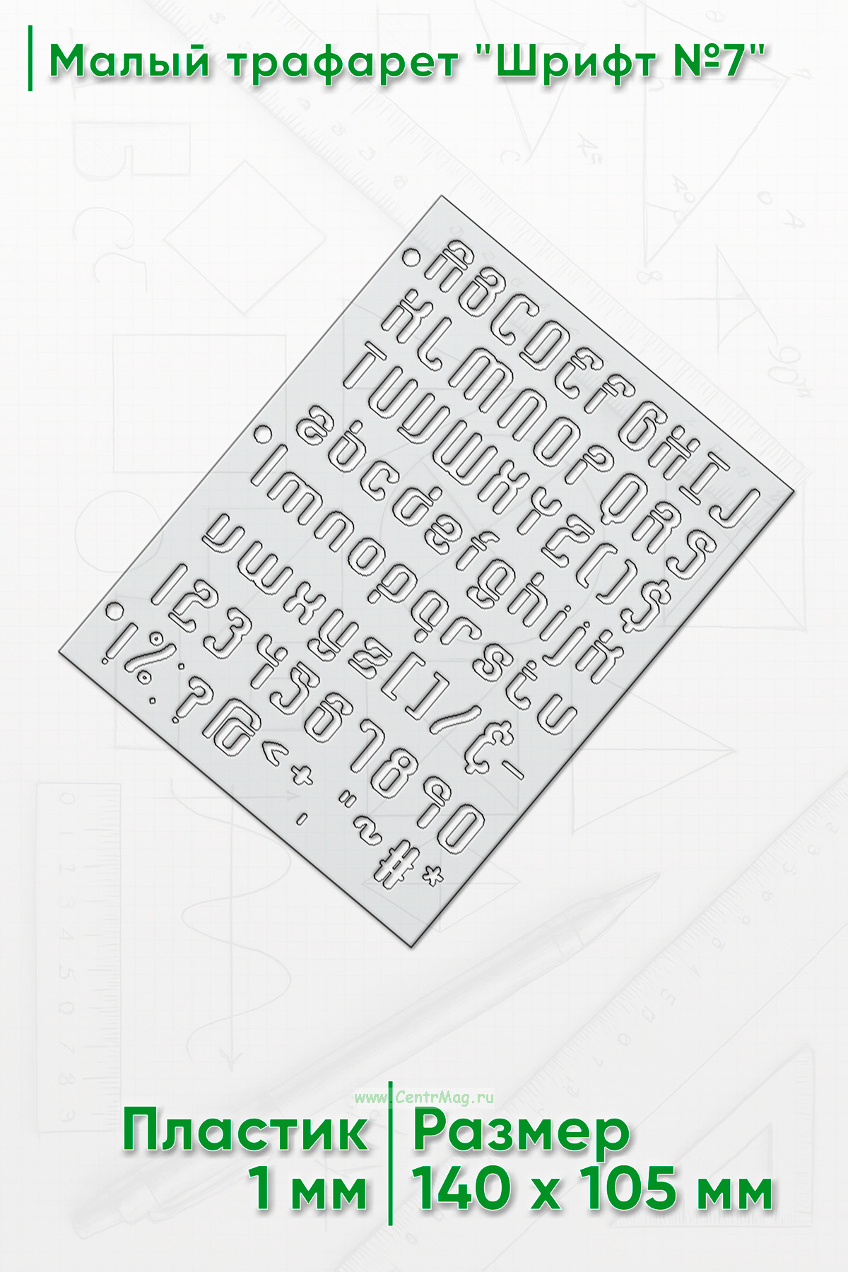 Трафарет позволит быстро наносить информацию на любые ровные поверхности. Высота символов 11 мм. Прочный и упругий материал позволяет пользоваться трафаретом много раз. Отверстия сбоку позволяют прикрепить один или несколько трафаретов к планшету или папке.