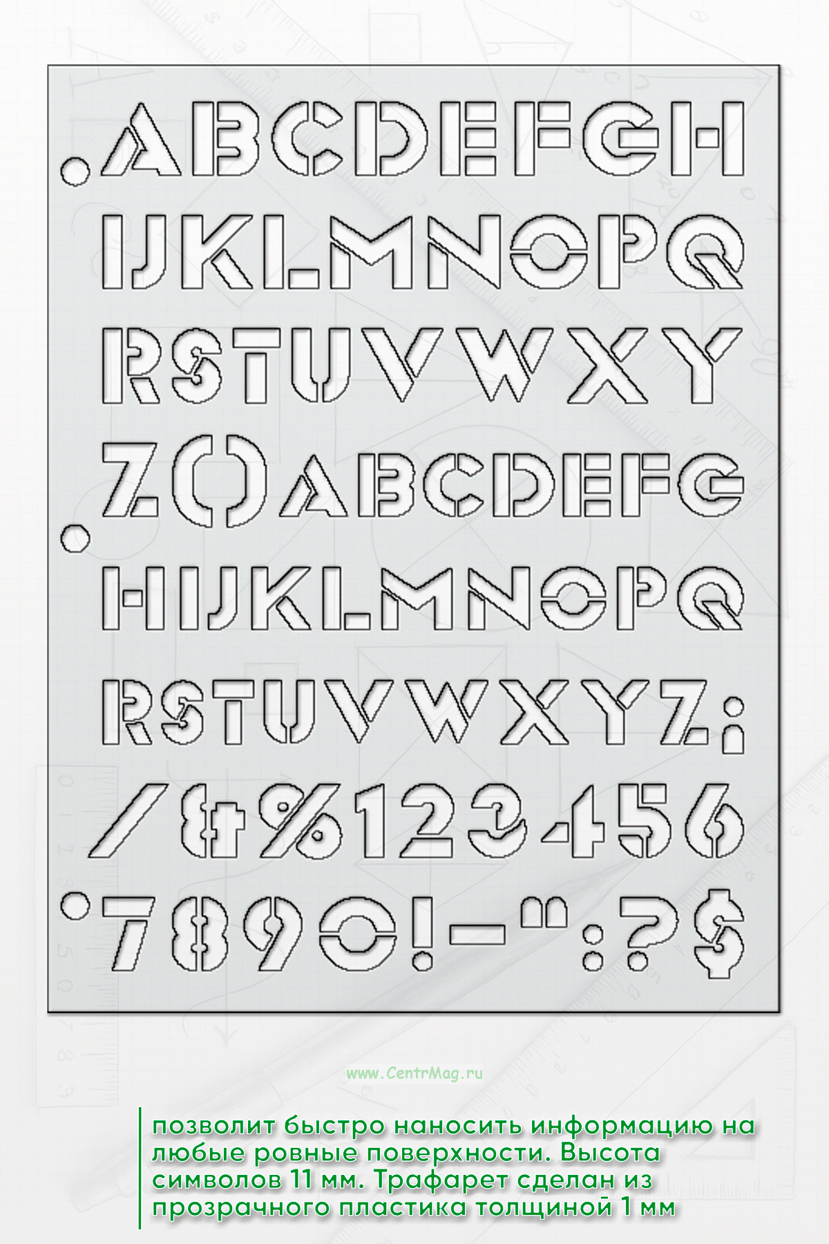 Трафарет позволит быстро наносить информацию на любые ровные поверхности. Высота символов 11 мм. Трафарет сделан из прозрачного пластика толщиной 1 мм. Прочный и упругий материал позволяет пользоваться трафаретом много раз. Отверстия сбоку позволяют прикрепить один или несколько трафаретов к планшету или папке.